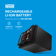 Newell's VW-VBT380 replacement battery for use with compatible Panasonic photo/video equipment features a special charge level indicator. 4 LEDs will allow you to quickly and conveniently assess whether the cell requires recharging. The illuminated indicators correspond to 25, 50 75 and 100 percent energy. This innovative solution makes using your camera or camcorder even more convenient.