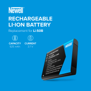 Battery replacements are Newell's flagship products. The Li-50B cell has been perfectly matched to the camera's battery compartment and compatible external chargers. Precise reproduction of the shape of the original cell guarantees the highest level of safety and trouble-free installation.