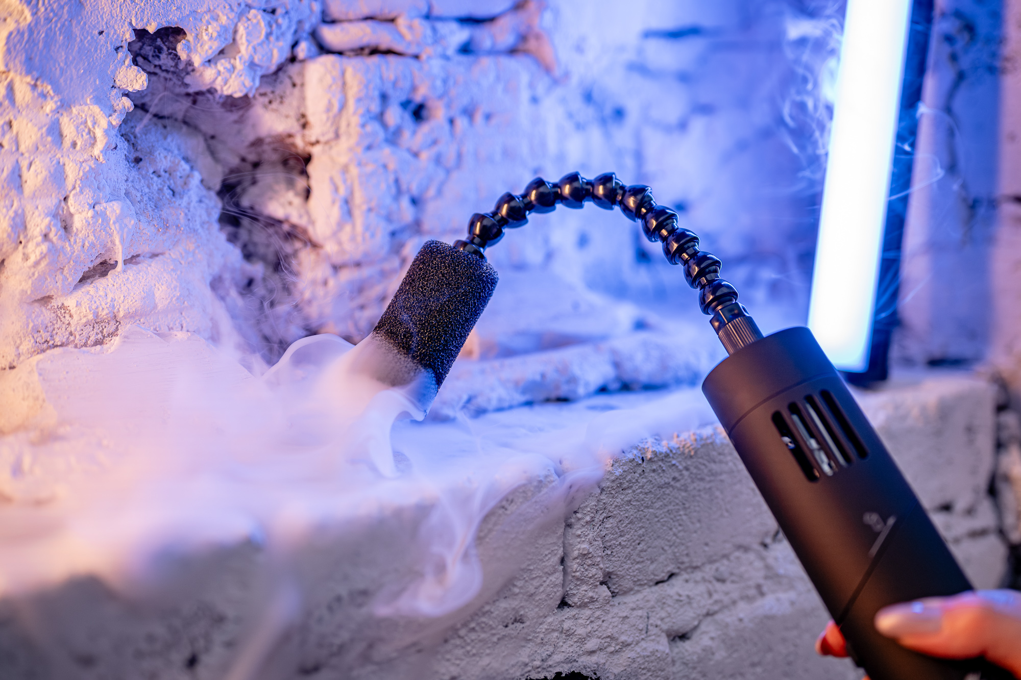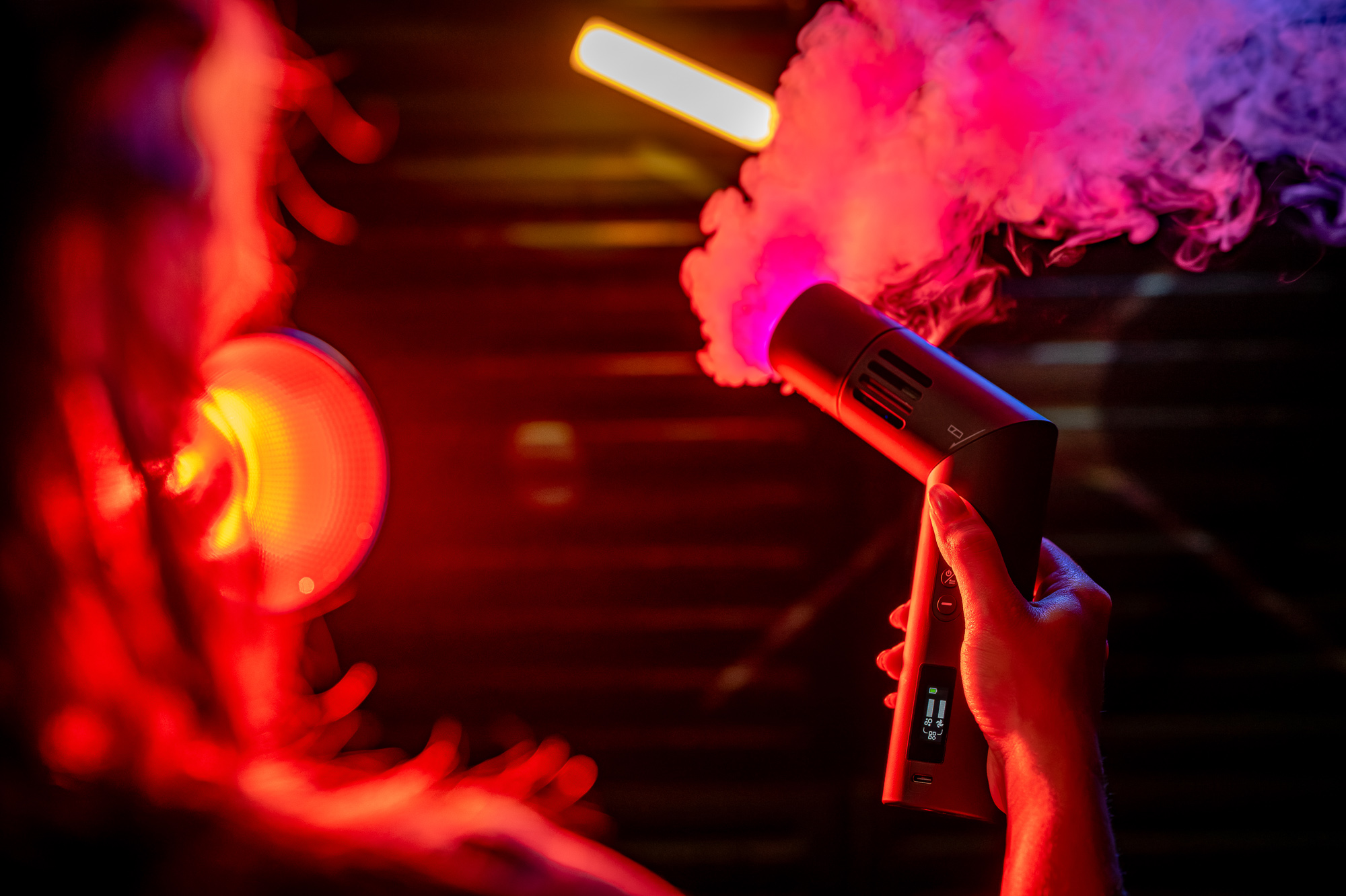 What would smoke be without light? Newell Mr Mist takes a creative approach to this question. You'll find a special magnetic module with a built-in RGB ring and an additional fan. It will make your frames even more interesting - from cool blue tones to fiery red. It's a powerful narrative tool that works well in both portrait photography and staged video frames. Lighting smoke with such precision allows you to achieve studio-like effects, even in home or outdoor settings. The ability to adjust the color infinitely gives you almost unlimited influence over the mood of the scene.