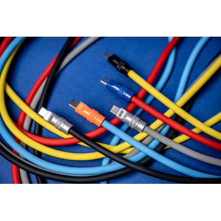 Once you touch this cable, you will never want to go back to ordinary cables made of cheap plastic. However, the silicone coating is not only pleasant to the touch. The material also guarantees high flexibility and resistance to tangling. The cable does not break, does not stiffen in low temperatures, and does not "take on a life of its own" when rolled up. Its 5.4 mm thickness guarantees above-average durability. It can be rolled up, crumpled in a bag, or dragged across a desk many times without fear of breakage or abrasion. The set also includes a silicone band to secure the cable when rolled up.