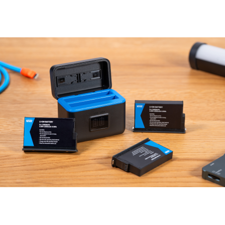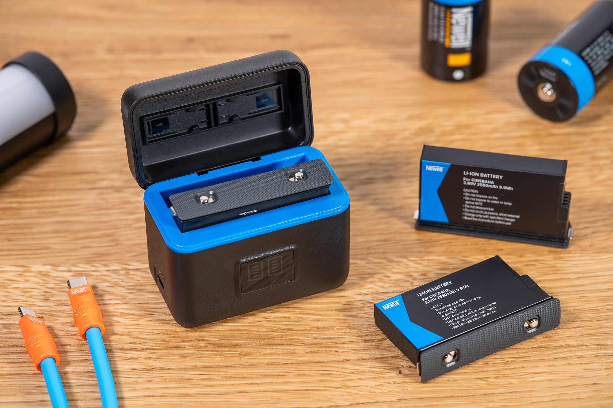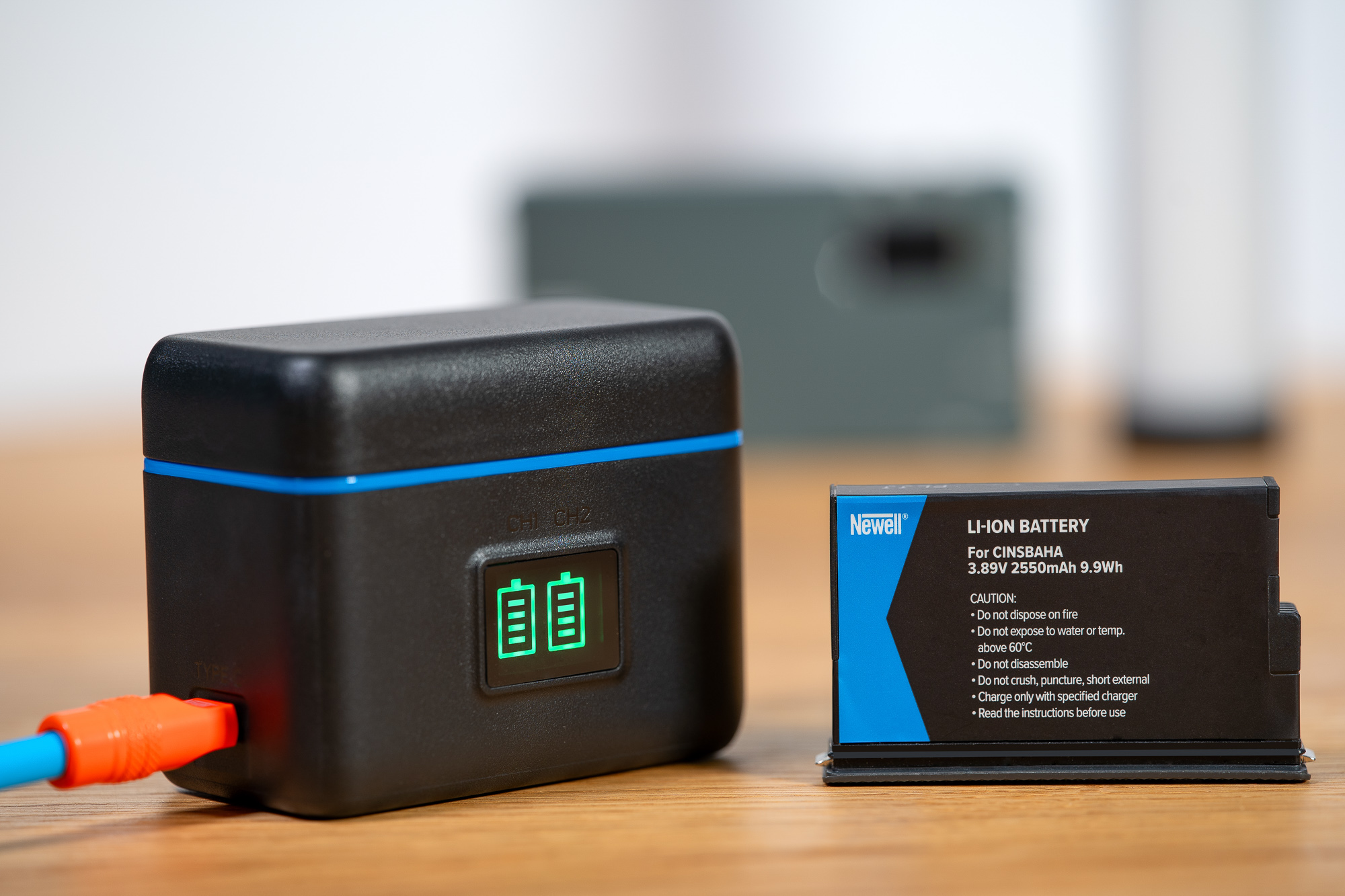 The Newell STD-USB dual-channel charger for CINSBAHA batteries for Insta360 X5 is designed for maximum mobility. The USB-C port allows you to power from various sources: a traditional mains charger (e.g., for a smartphone), a power bank, or a car charger. The 5V/3A input means you can recharge your batteries virtually anywhere – in the car on the way to the set, on a mountain trail, or in a hotel after a busy day. This flexibility allows you to operate without worrying about access to a power outlet.