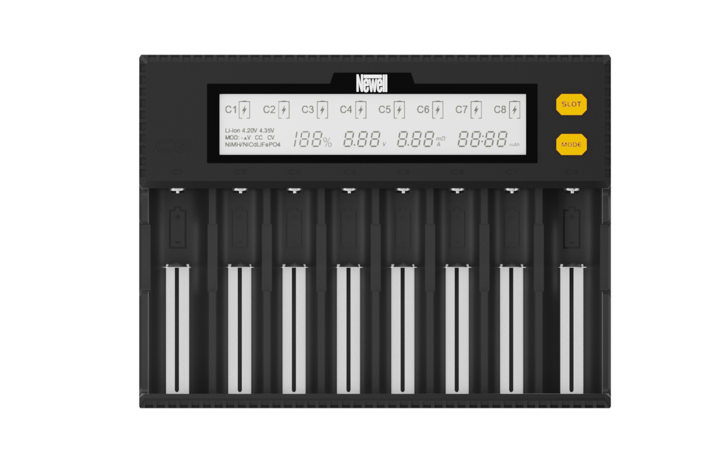 Newell C8 to uniwersalna, ośmiokanałowa ładowarka, kompatybilna z większością cylindrycznych akumulatorów dostępnych w sprzedaży. Wyświetlacz LCD pokazuje napięcie, natężenie, czas ładowania, opór wewnętrzny oraz stan naładowania ogniwa – wszystko to pozwala z łatwością określić parametry i status procesu. Specjalnie zaprojektowana obudowa umożliwia jednoczesne ładowanie nawet największych akumulatorów (typu C lub 22650) jednocześnie we wszystkich ośmiu kanałach.