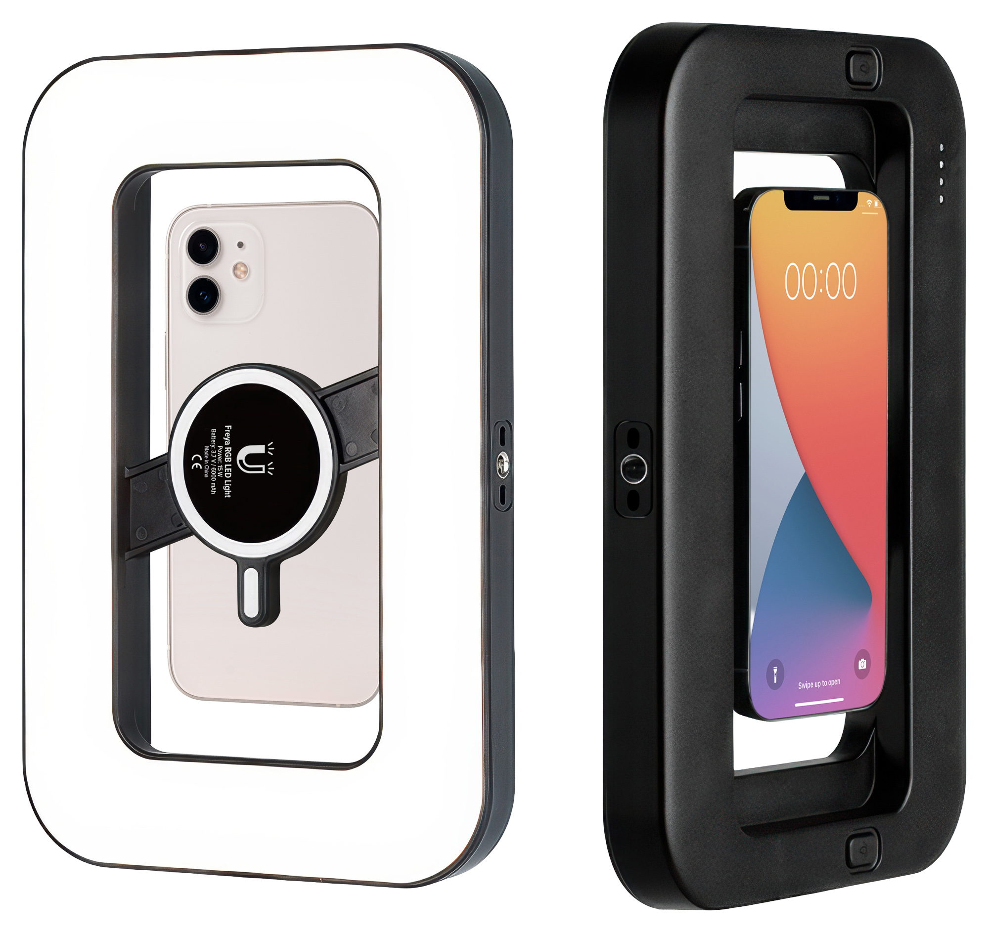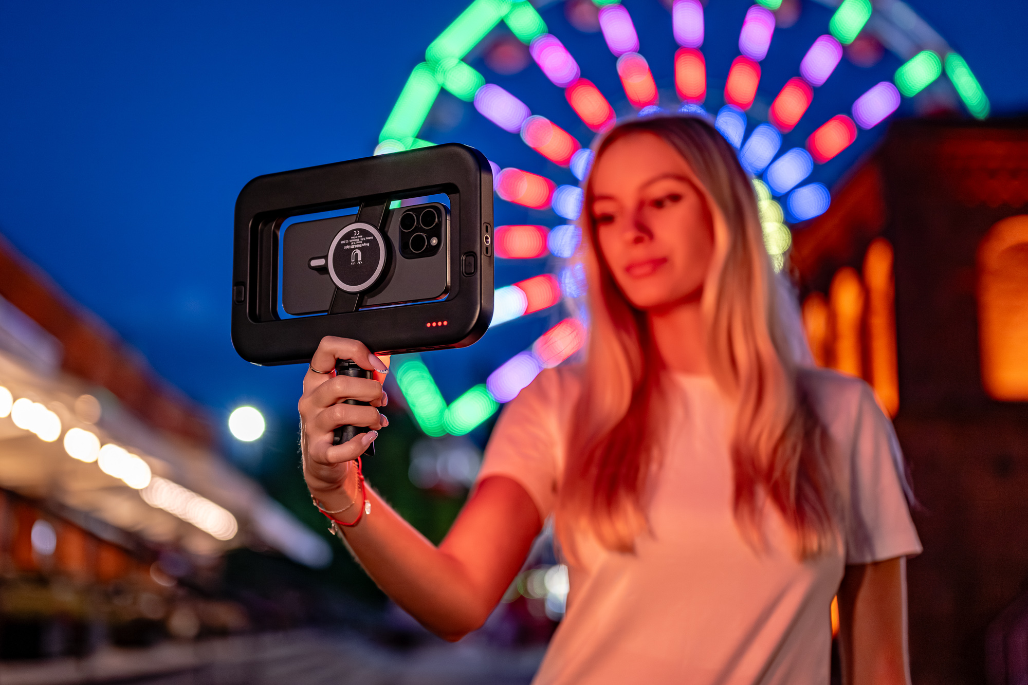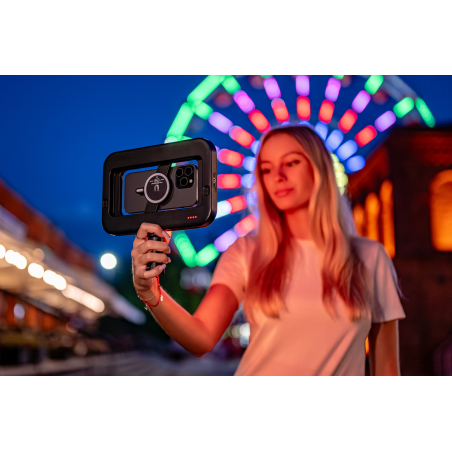 Newell Freya is a state-of-the-art LED light with a magnetic smartphone mount, combining light, grip and cinematographer's cage function in one compact design. With MagSafe technology (or the included ring), you will stably install your phone in the center of the frame. Four LED panels provide even illumination for your frames. You can turn off selected segments as needed. Adjustable color temperature (2500-6500 K), full RGB color spectrum (0-359°), CRI 95+ and built-in 3000 mAh battery give you full working freedom. Comes with a ministat and three 1/4" threads for mounting additional accessories. Ideal for vlogging, broadcasting, shooting and creative shots - in the studio and in the field. Product covered by Newell's 40-month support program.
