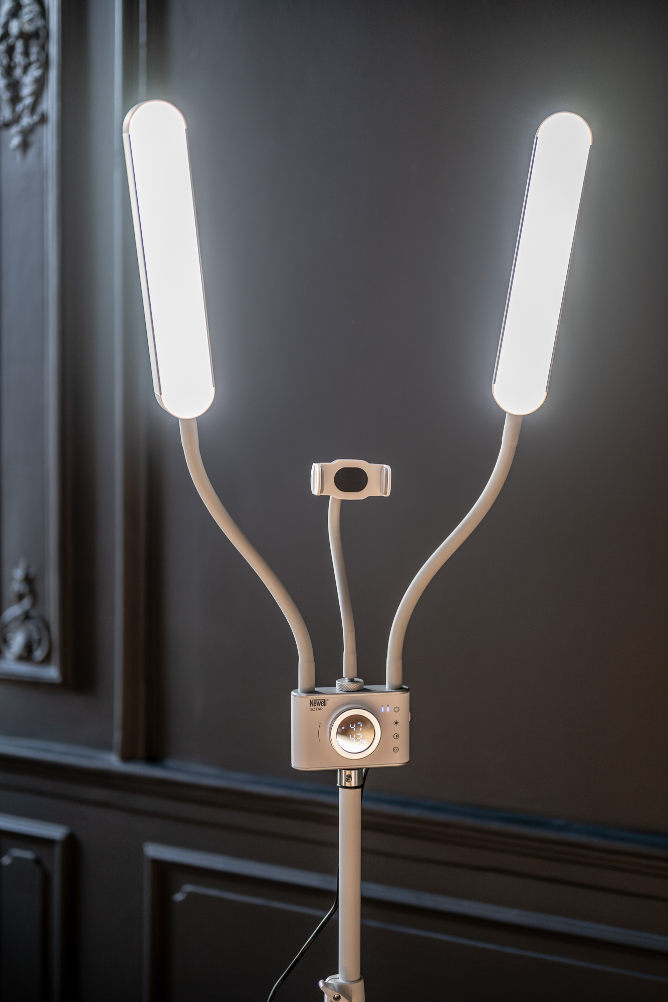 Newell Isztar LED light is everything you need to create professional video content without having to reach for additional tools and accessories. All you need is your smartphone! With two lamps on flexible arms that can be adjusted to almost any angle, you'll get perfect, even illumination of your face. A phone holder is placed between them to ensure comfortable and stable recording. Whether you're standing or sitting, the tripod will allow you to precisely position your frame. With this kit, you can precisely illuminate your shots, adjust the type of light to meet the needs of your shots and create even better video content.