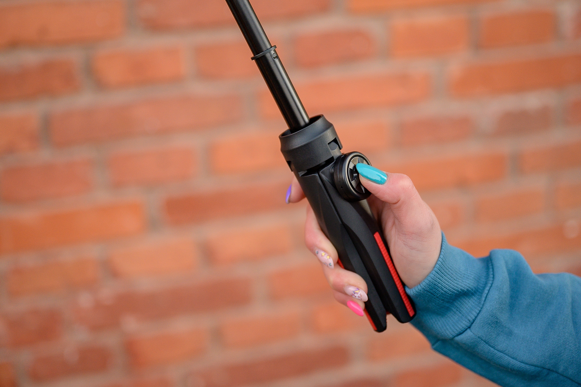 The smartphone holder supports devices from 56 to 86mm wide. Two red buttons will allow you to lock the clamp in the optimal position, and rubber facings will protect the edges of the device you're recording with. You can position your phone vertically or horizontally, and adjust the angle if necessary. The Fotopro SY-100 tripod with SJ-86 Pro mount also offers an additional mounting point located on the articulating arm. You can fold it up and hide it behind the handle when needed. And when you're using it, the swivel head allows you to reposition the module nearly 360º relative to your smartphone.