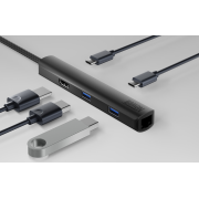 Hub Newell 6 w 1 to uniwersalny rozgałęźnik podłączany do złącza USB-C. Niewielkie urządzenie wyróżniające się stylową, podłużną obudową pozwoli skutecznie rozszerzyć funkcjonalność Twojego komputera lub tabletu. Hub oferuje: 2 porty USB 3.0, 2 porty USB-C (w tym jeden wspierający technologię szybkiego ładowania Power Delivery 100 W), port HDMI (4K 60 Hz) i gniazdo RJ45. Maks. prędkość transmisji danych wynosi tu 5 Gb/s. Gniazdo RJ45 umożliwia podłączenie kabla sieciowego i korzystanie z transmisji danych do 1 Gb/s. Aluminiowa obudowa gwarantuje ultralekkość i skuteczną ochronę przed uszkodzeniami. Ten hub to idealny wybór, gdy potrzebujesz dostępu do większej ilości portów lub kiedy Twoje urządzenie ma wejście USB-C, ale brakuje w nim wejść USB typu A, oraz portu HDMI i gniazda RJ45.