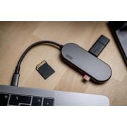 Hub Newell 7 w 1 to uniwersalny rozgałęźnik podłączany do złącza USB-C. Niewielkie urządzenie rozszerzy funkcjonalność Twojego komputera lub tabletu o 3 porty USB 3.0, 1 port USB-C, port HDMI (4K) i 2 czytniki kart pamięci (SD oraz micro SD). Maksymalna prędkość transmisji danych wynosi tu 5 Gb/s. Port USB-C jest kompatybilny z ładowarkami o maks. mocy 100 W (technologia Power Delivery). Aluminiowa obudowa to gwarancja ultralekkości i odpowiedniej ochrony przed uszkodzeniami mechanicznymi. Będzie to idealny wybór, gdy potrzebujesz dostępu do większej ilości portów lub kiedy Twoje urządzenie ma wejście USB-C, ale brakuje w nim wejść USB typu A, czytników kart pamięci oraz gniazda HDMI.