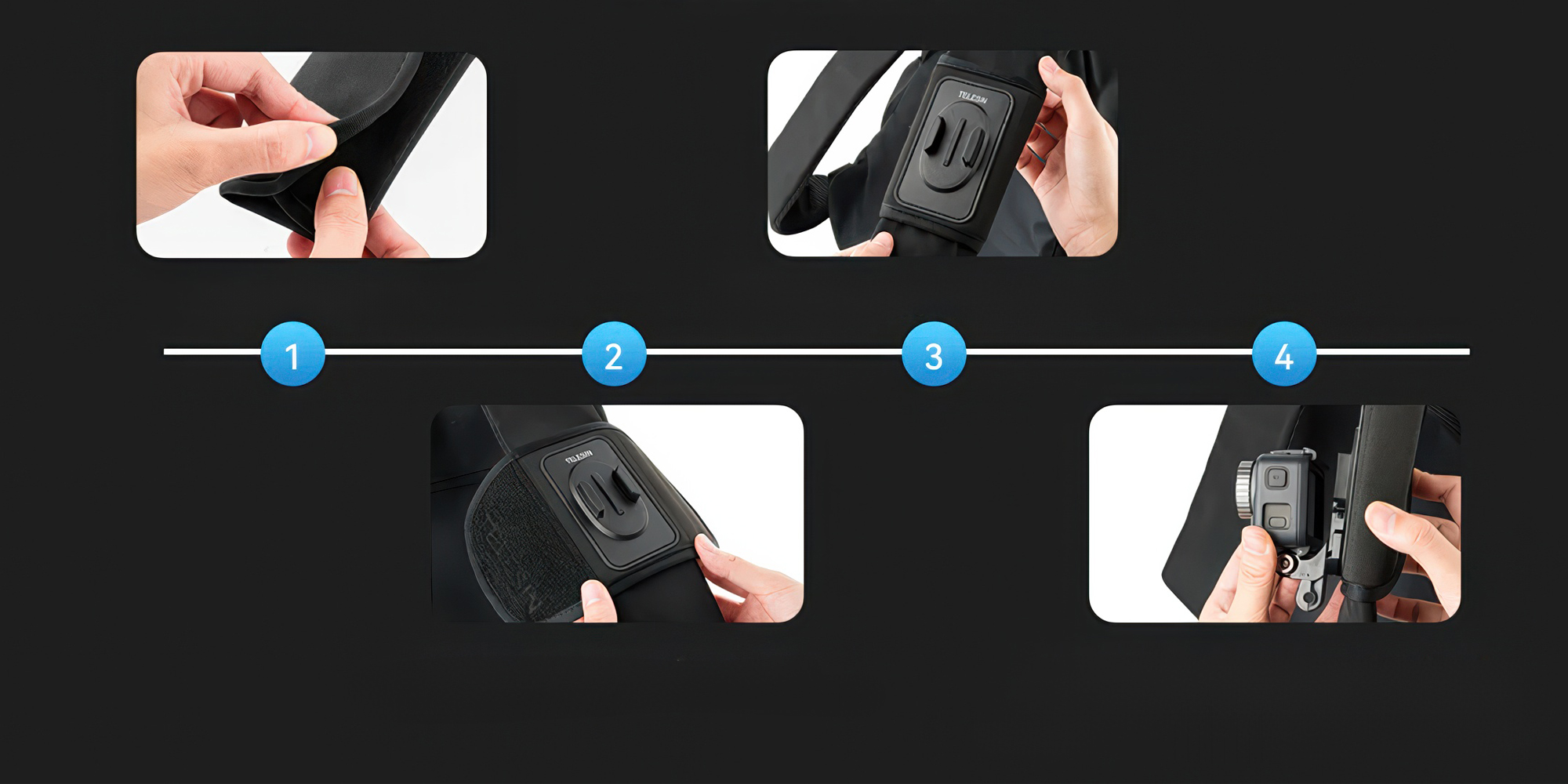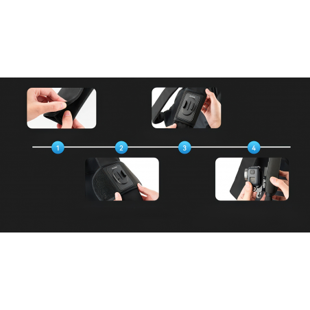 Mocowanie na plecak Telesin GP-BPM-005 wykorzystuje solidny system rzepów Velcro, który umożliwia szybki montaż i demontaż bez użycia narzędzi. Antypoślizgowy pasek wykończony silikonowymi wstawkami w kształcie litery „T” oraz skórą PU zapobiega przesuwaniu się uchwytu, nawet przy bardzo dynamicznych ruchach. Dzięki regulowanej konstrukcji uchwyt z łatwością dopasujesz do różnych grubości szelek – od plecaków miejskich, po bardziej trekkingowe.
