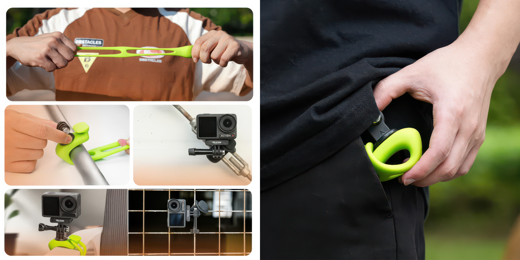 Mocowanie Telesin TLQ-001 wykonano z silikonu i wzmocniono elementami ze stali nierdzewnej oraz aluminium. Jest odporne na trudne warunki atmosferyczne, zabrudzenia i zużycie. Czarny kolor podkreśla profesjonalny charakter akcesorium, a kompaktowa forma sprawia, że z łatwością zmieści się w torbie ze sprzętem lub kieszeni. To niezawodne rozwiązanie do pracy w plenerze, na rowerze, w podróży i w każdych warunkach pogodowych.