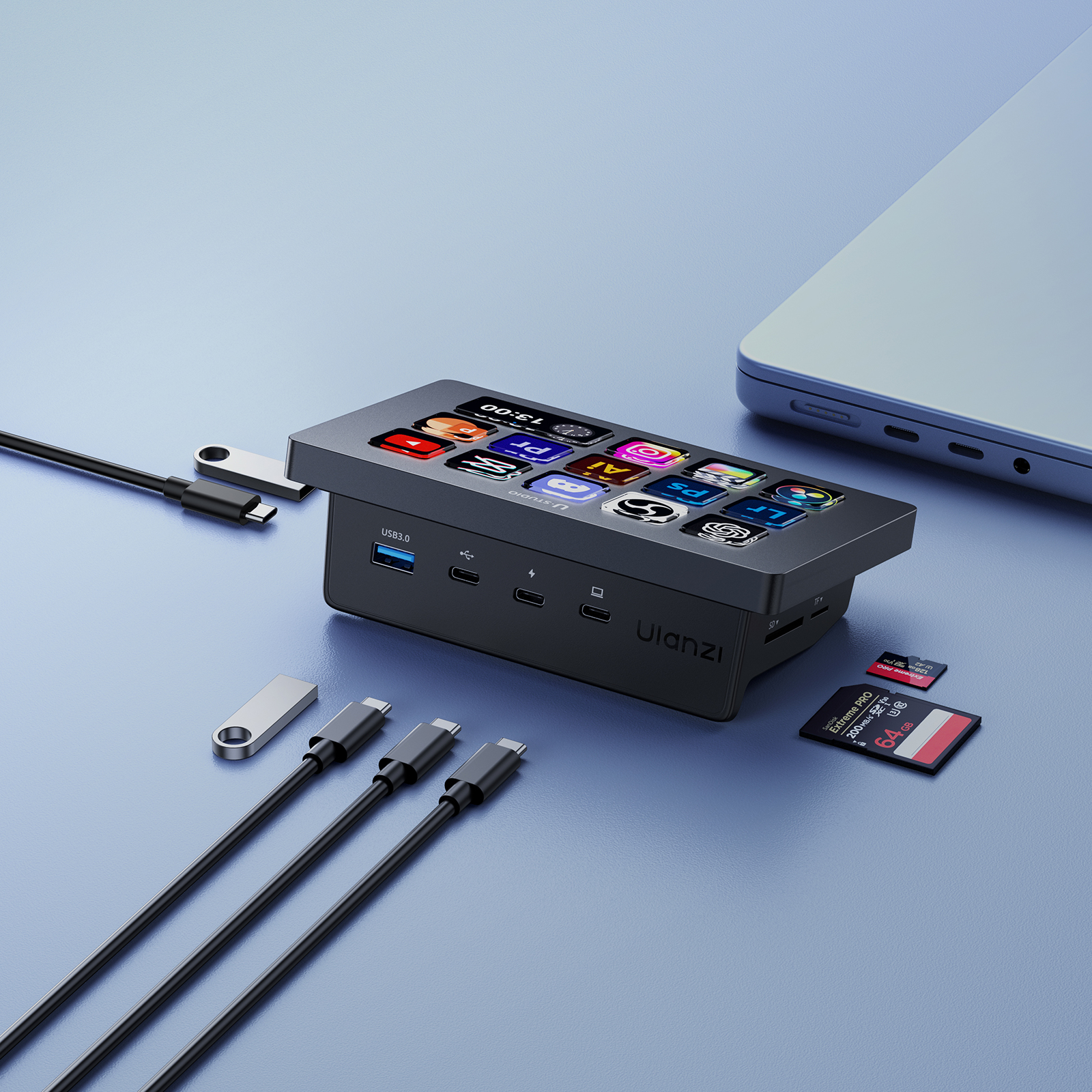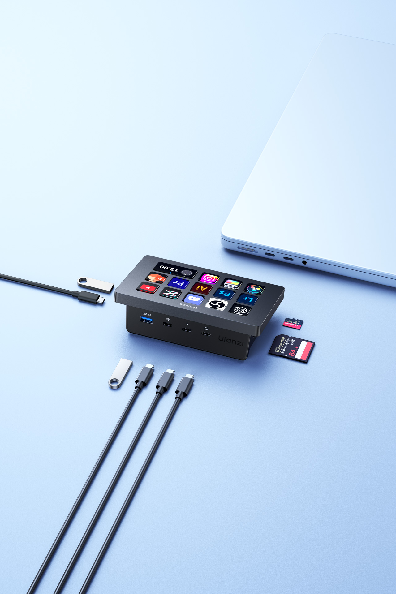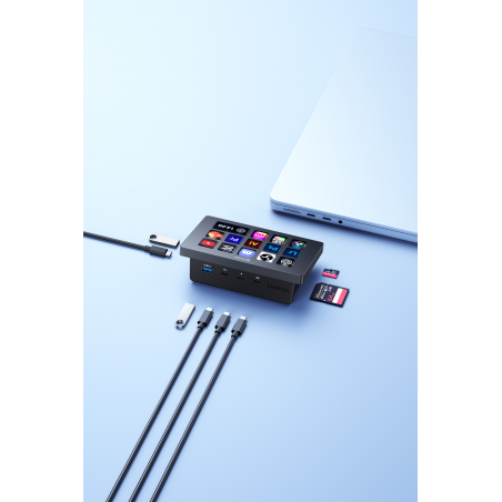 Ulanzi Stream Deck D200H to coś więcej niż tylko konsola ułatwiające zarządzanie systemem operacyjnym i aplikacjami. Urządzenie pozwoli również rozszerzyć Twój komputer o dodatkowe porty. To praktyczna stacja dokująca z szybkim ładowaniem 100 W, slotami na karty SD i microSD, a także portami USB-A i USB-C. Możesz podłączyć do niej mikrofon, kamerę, zewnętrzny dysk czy smartfon – wszystko będzie dostępne z jednego miejsca. To idealne rozwiązanie dla tych, którzy cenią porządek i najlepszą wydajność sprzętowych setupów.