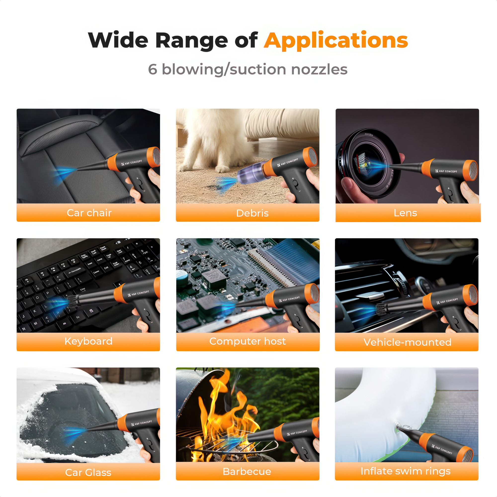 Dziesiątki zastosowań dmuchawy wielofunkcyjnej K&F Concept 14w1 to zasługa bogatego zestawu akcesoriów, które znajdziesz w pudełku razem z urządzeniem. To m.in.: