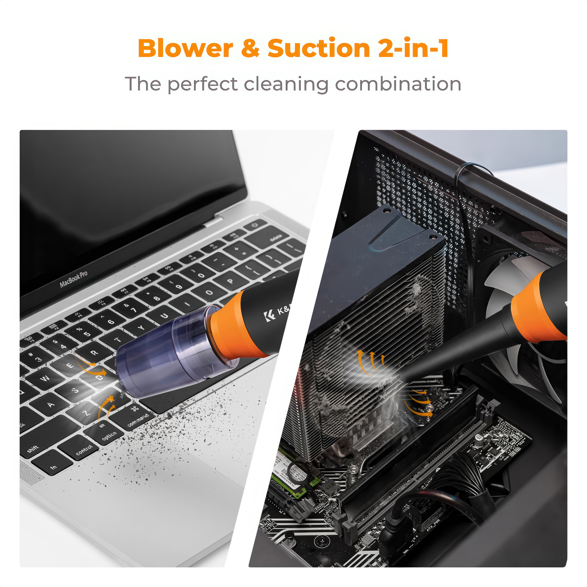 Dmuchawa wielofunkcyjna K&F Concept 14w1 to bezprzewodowe urządzenie, które łączy mocny nadmuch z funkcją zasysania powietrza. Bezszczotkowy silnik generuje skoncentrowany strumień powietrza (do 54 m/s), dzięki czemu szybko usuwa kurz ze szczelin, kratek wentylacyjnych czy innych trudno dostępnych miejsc. W trybie odkurzacza pozwala też zbierać okruchy i drobiny, zamiast je rozdmuchiwać. Płynna regulacja mocy suwakiem, pojemny akumulator oraz szybkie ładowanie przez port USB-C sprawiają, że to praktyczna alternatywa dla puszek ze sprężonym powietrzem – w domu, w aucie i w podróży. Bogaty zestaw końcówek ułatwi nie tylko czyszczenie różnych typów zabrudzeń, ale też pompowanie i odkurzanie.