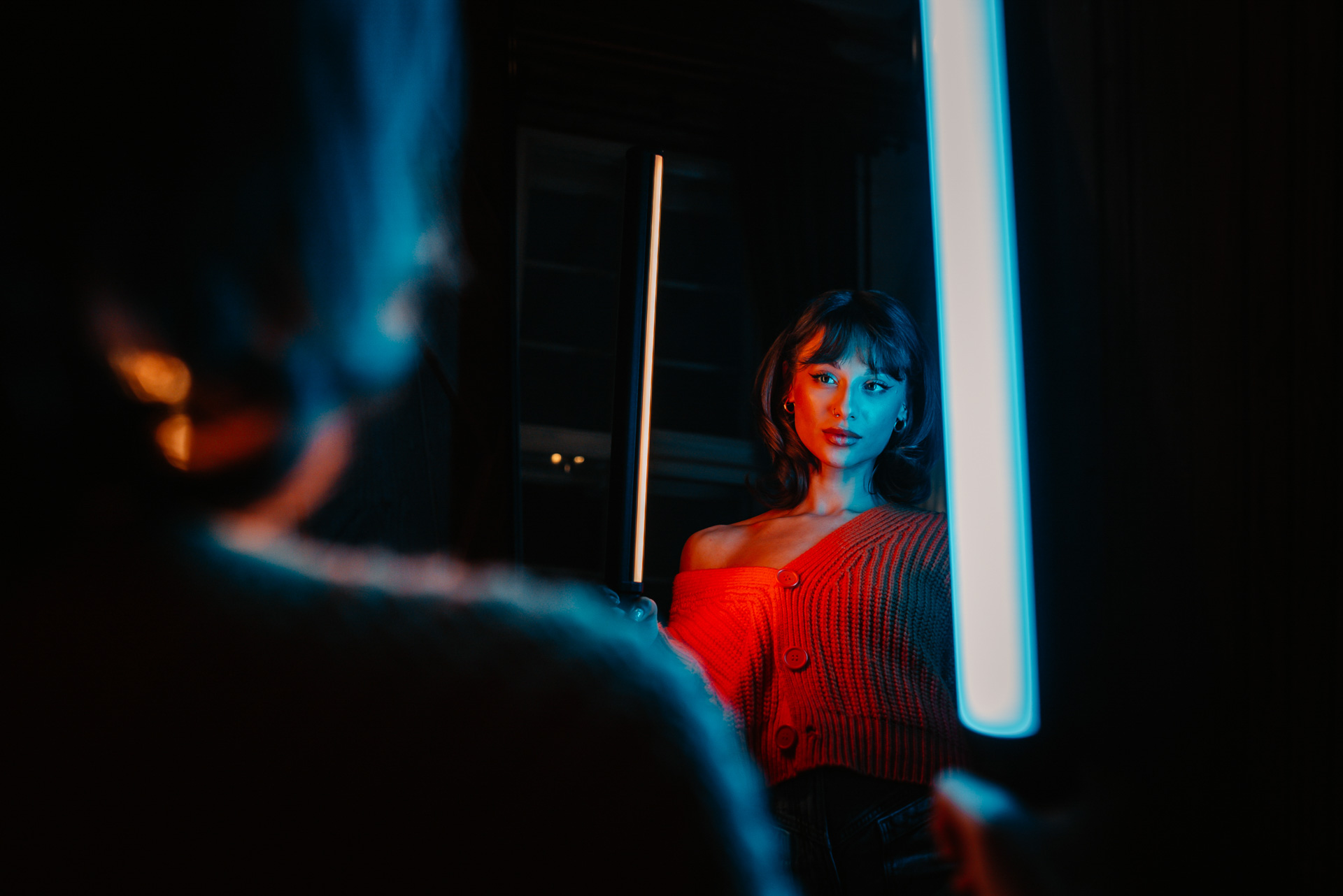 W porównaniu do pierwszej wersji, lampa LED Newell RGB Kathi Pro II oferuje nie tylko zwiększoną moc, ale także bardziej przemyślaną ergonomię obsługi. W poprzednim modelu włącznik znajdował się w górnej części miecza, co bywało niewygodne w trakcie pracy. Teraz został przeniesiony do panelu sterującego, dzięki czemu jest zawsze pod ręką. To drobna, ale istotna zmiana, która znacząco podnosi komfort użytkowania i pozwala w pełni skupić się na tworzeniu ujęć.