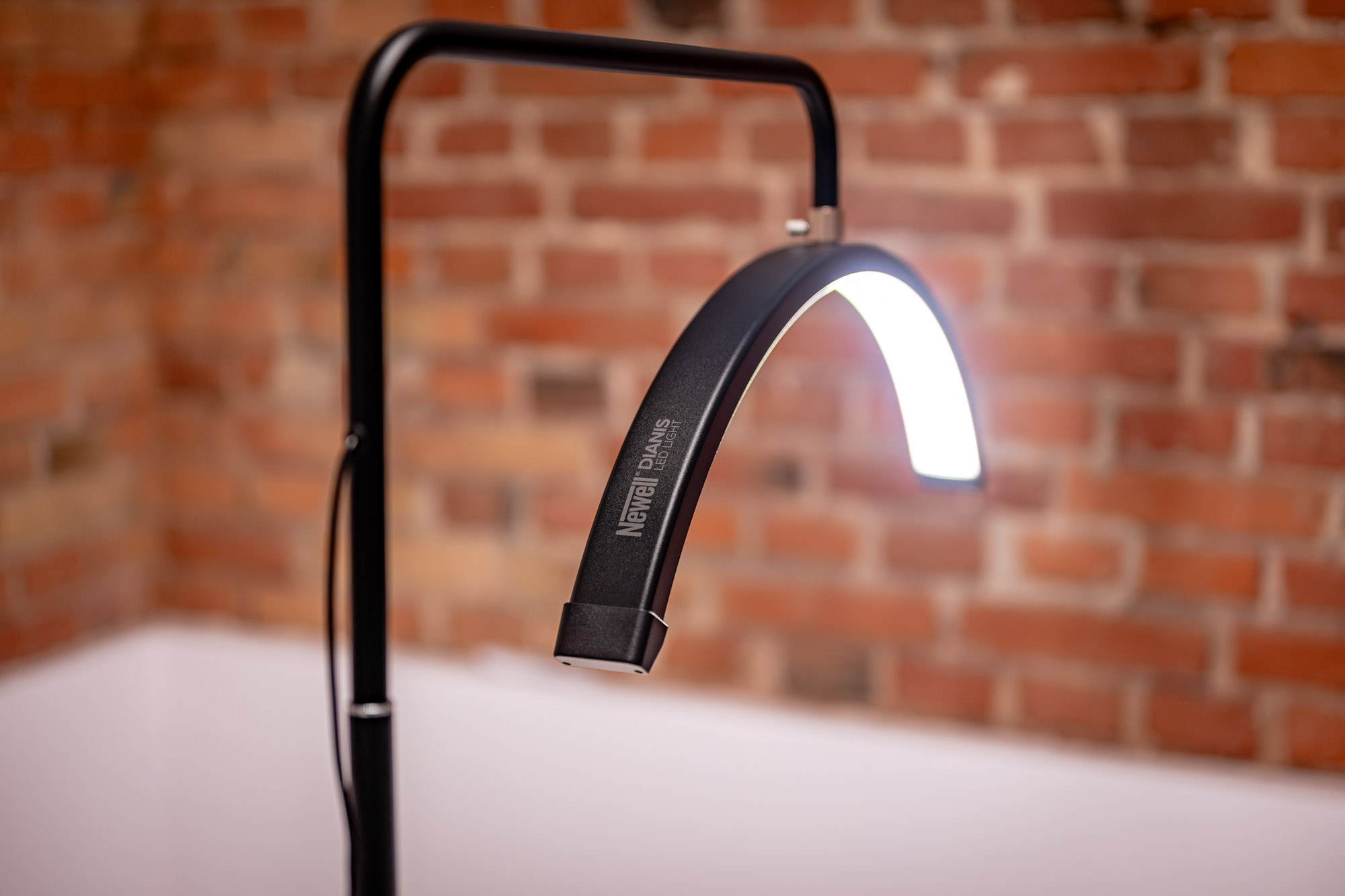 Dzięki regulacji jasności i temperatury barwowej lampa Newell Dianis pozwala dopasować światło do rodzaju wykonywanego zabiegu, co czyni ją niezastąpionym elementem wyposażenia każdego profesjonalnych stanowisk pracy.