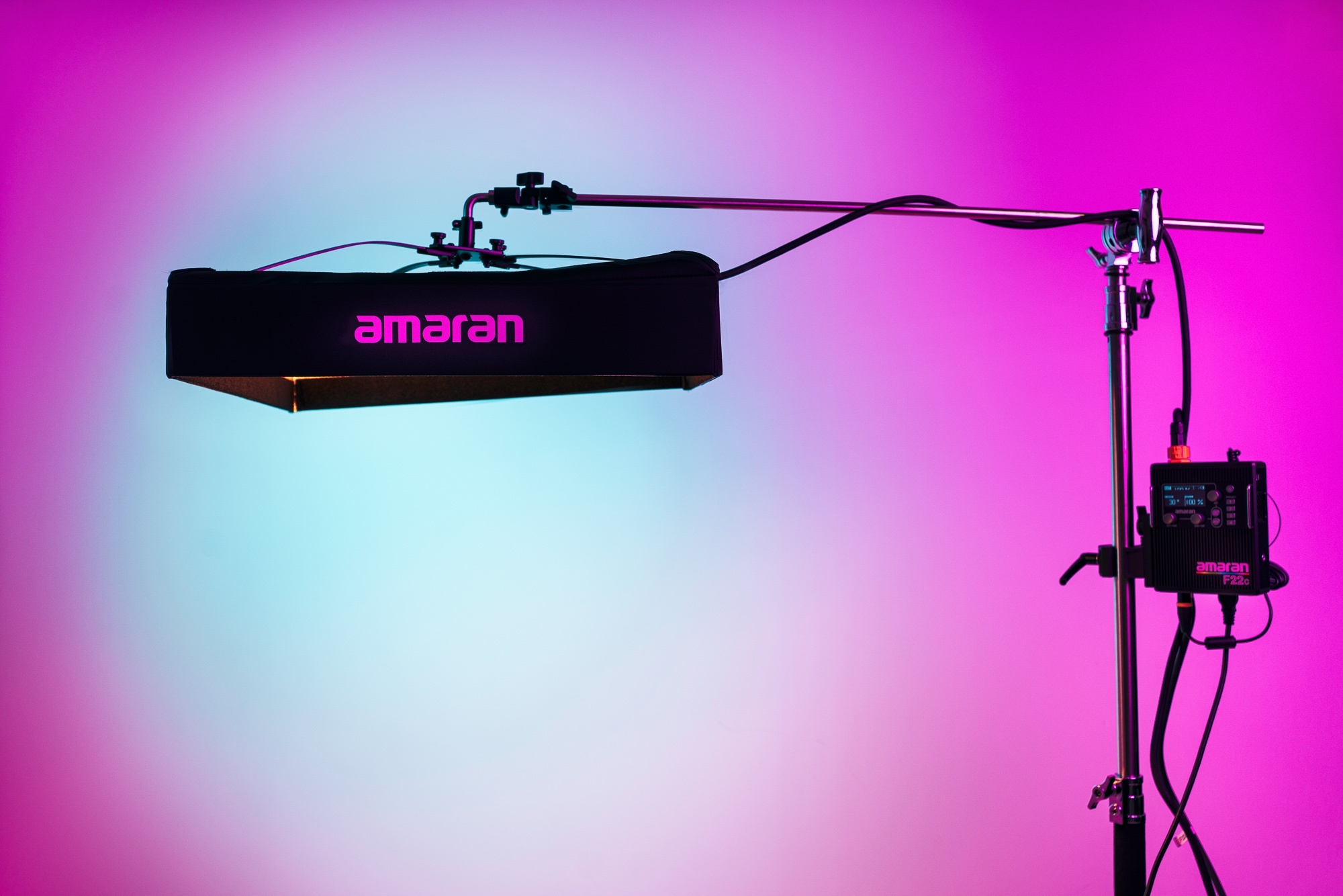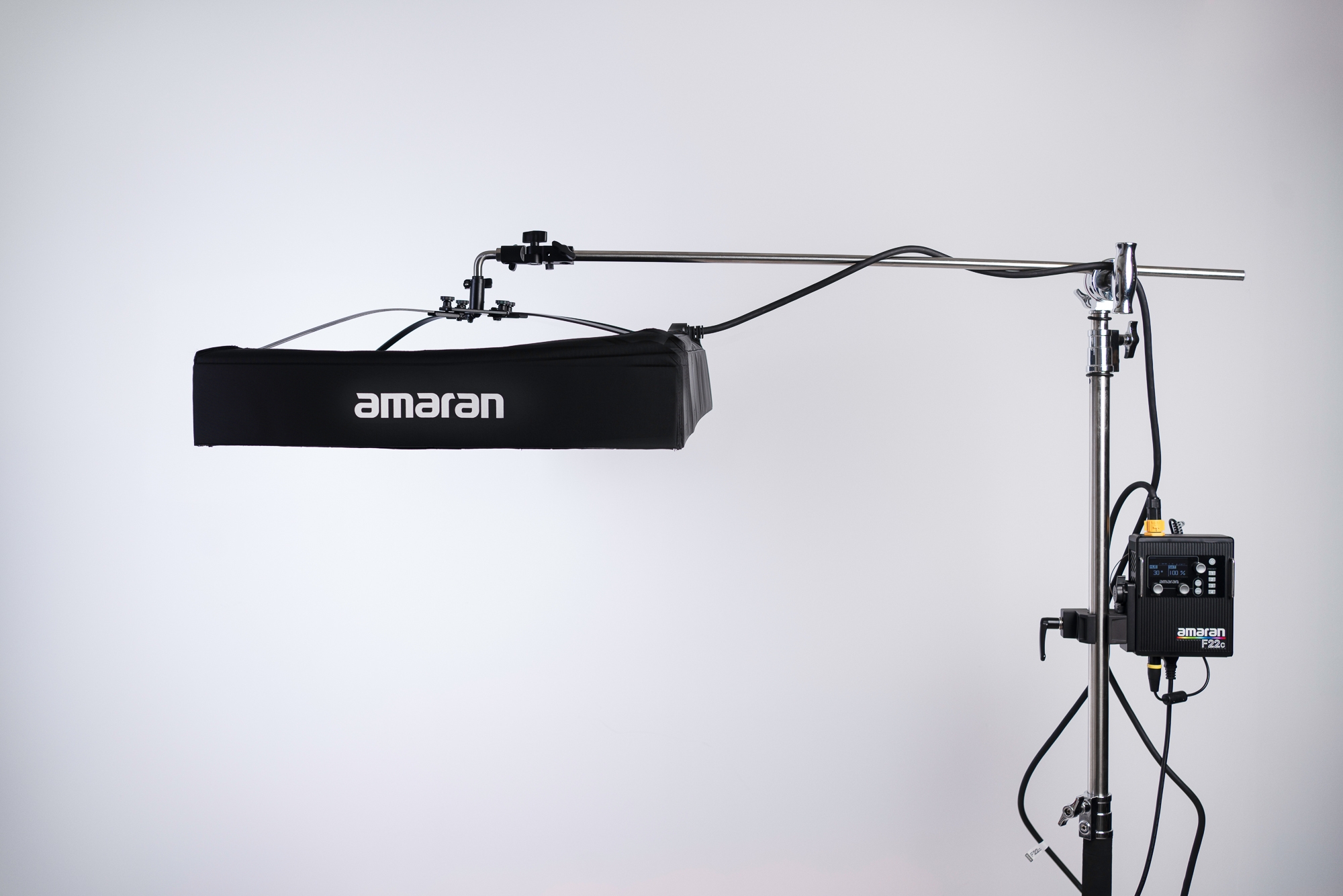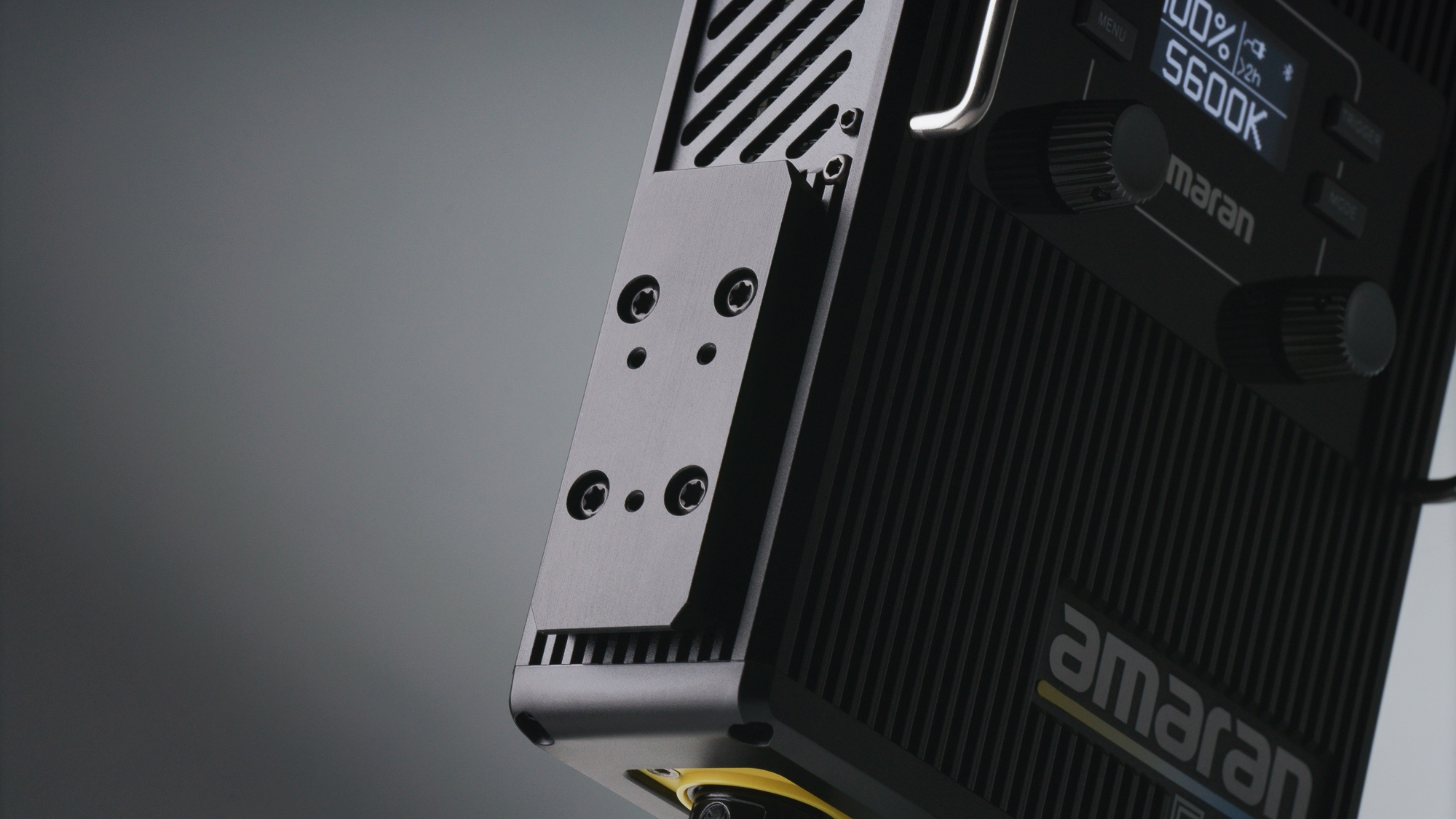 Dołączony do zestawu zewnętrzny kontroler Control Box pozwalający sterować lampą waży zaledwie 1,2 kg. Smukła skrzynka z pewnością przypadnie do gustu osobom, które ceniące sobie minimalizm i ergonomię pracy. Urządzenie wyposażono w jasny wyświetlacz OLED oraz wygodne w obsłudze przyciski, oraz pokrętła. Na jego obudowie znajdziesz płytkę szybkiego montażu, z którą możesz połączyć uchwyt Lighting Clamp. Nie zabrakło też metalowej linki pozwalającej bezpiecznie zawiesić kontroler w wybranym miejscu.