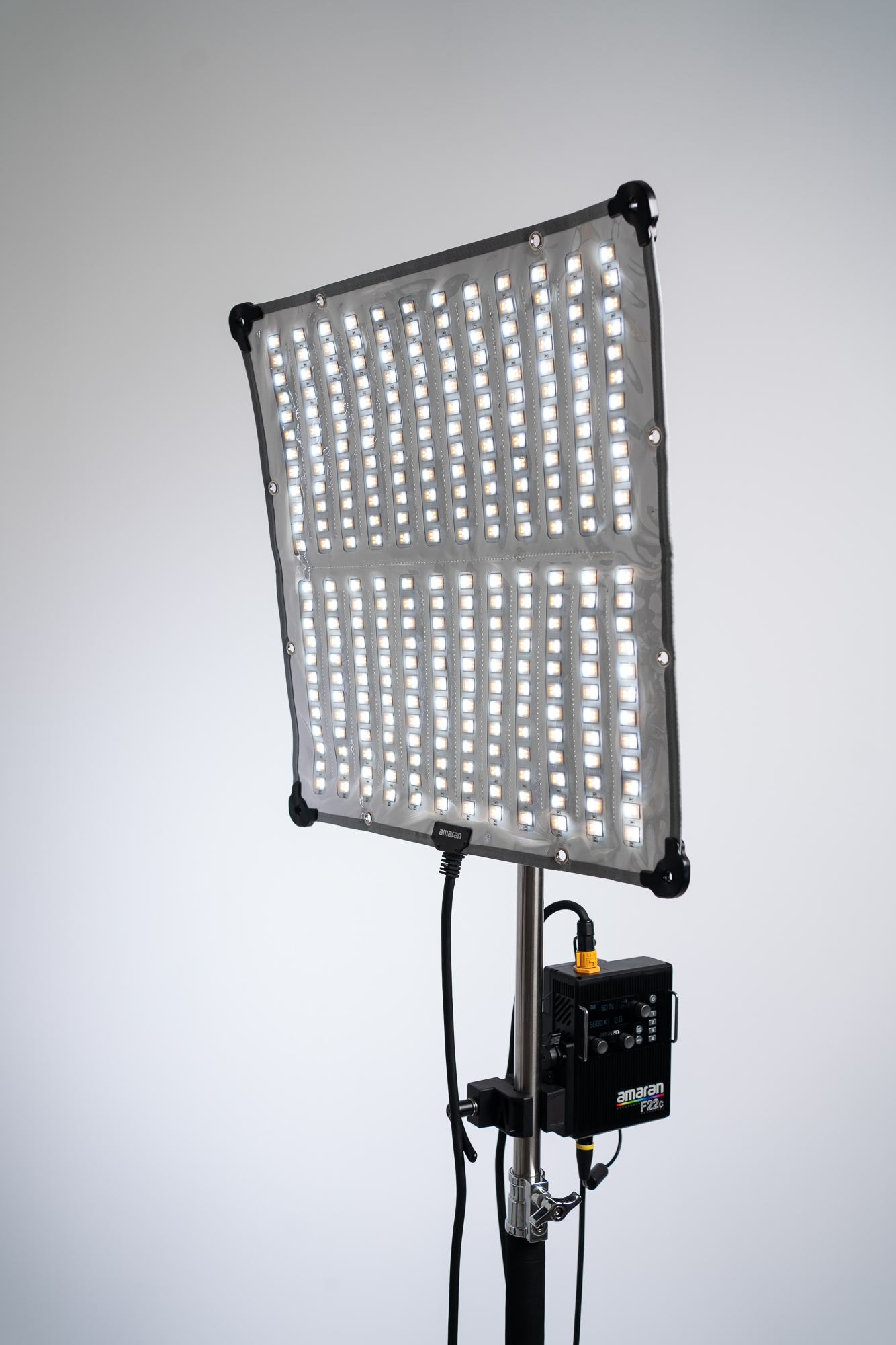 Amaran F22c - V-mount to elastyczna mata świetlna o wymiarach 60 na 60 cm, która stanowi wspaniałą alternatywę dla ciężkich paneli LED, zamkniętych w dużych obudowach. To idealny wybór do pracy w ciasnych i trudno dostępnych miejscach. Urządzenie ma 5 mm grubości i waży zaledwie 880 g. Zainstalujesz je w dowolnym miejscu za pomocą taśmy, rzepów Velcro lub opasek zaciskowych. Maksymalna moc wyjściowa lampy to aż 200 W. Innowacyjne diody LED RGBWW pozwolą na pracę z kolorowym światłem (paleta HSI) i regulację temperatury barwowej (2500 K - 7500 K). Rozkładany uchwyt X-Frame umożliwi połączenie lampy z profesjonalnymi statywami i uchwytami. W zestawie nie zabrakło też softboxa, grida, zasilacza oraz walizki transportowej.