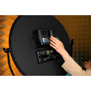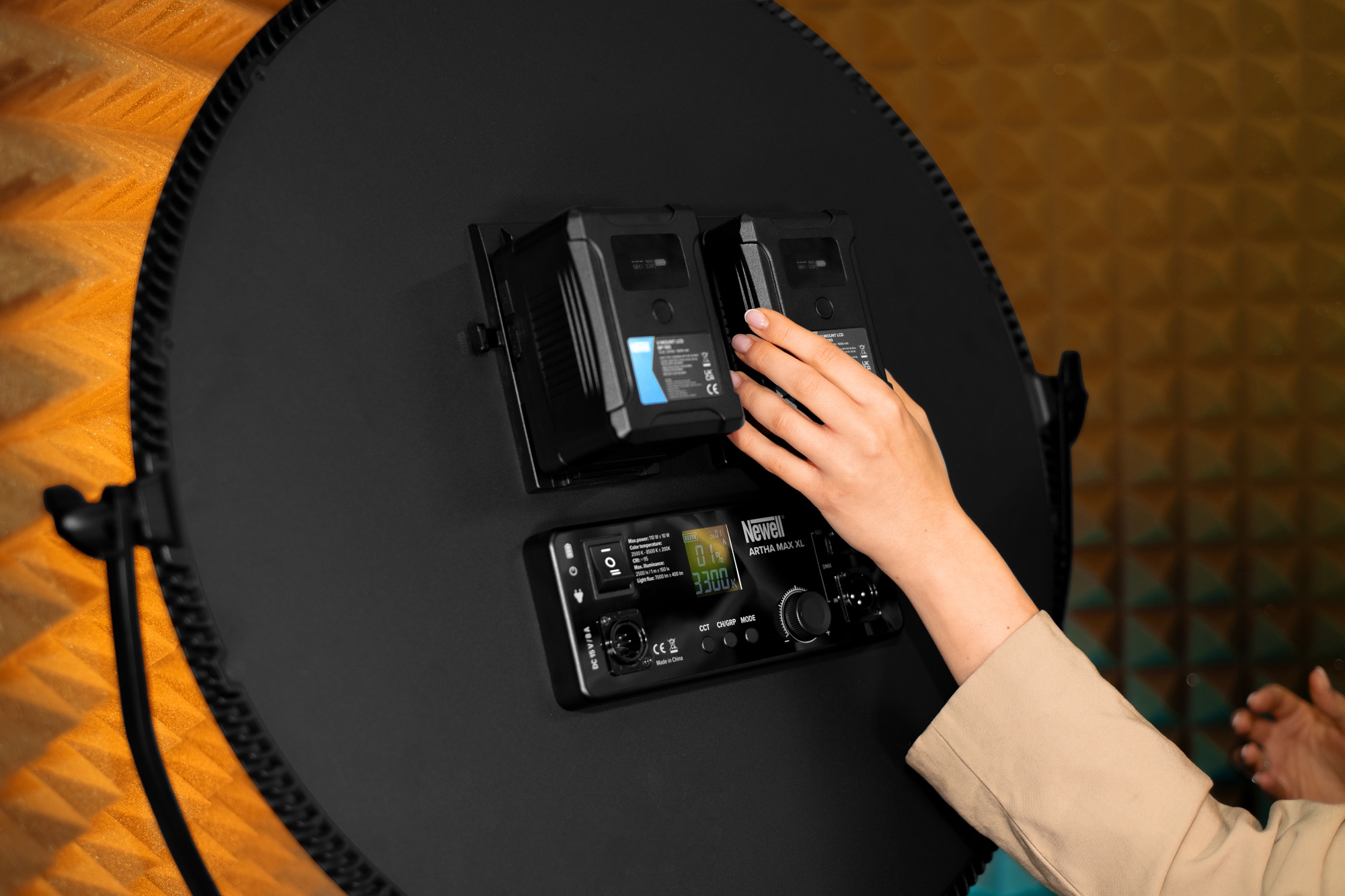 Dzięki dwóm różnym sposobom zasilania, lampa LED Newell Air Artha Max XL sprawdzi się w każdym miejscu – w studiu, w domu, a także w terenie. W zestawie znajdziesz kompatybilny zasilacz oraz kabel zasilający. To jednak nie wszystko. Urządzenie wyposażono również w 2 gniazda akumulatorów V-Mount (V-Lock). Dzięki temu wszędzie tam, gdzie dostęp do gniazdka elektrycznego jest ograniczony, możesz cieszyć się bezprzewodowym zasilaniem. Lampa LED Newell Air Artha Max XL może być zasilana jednym lub dwoma ogniwami V-Mount.
