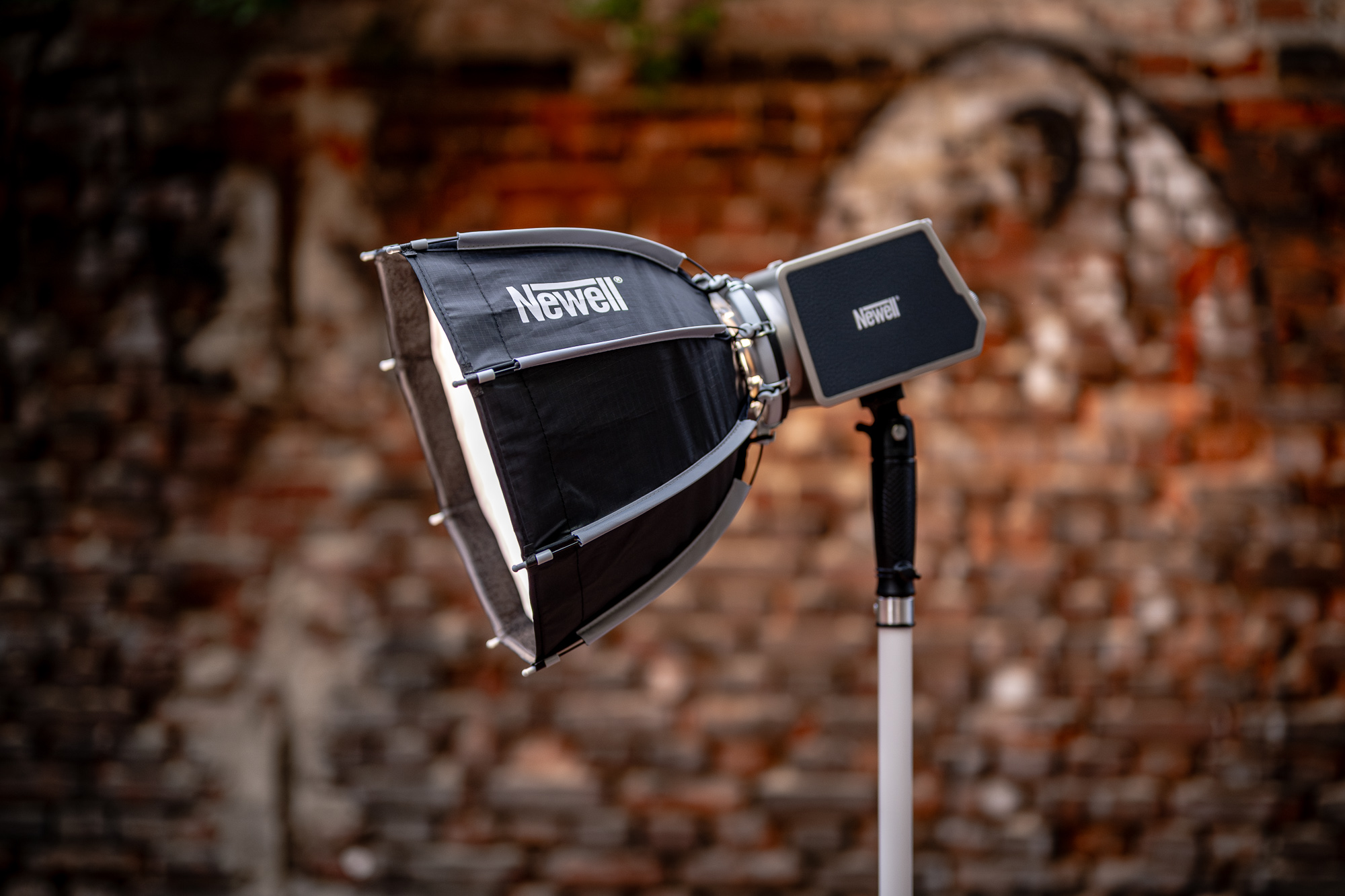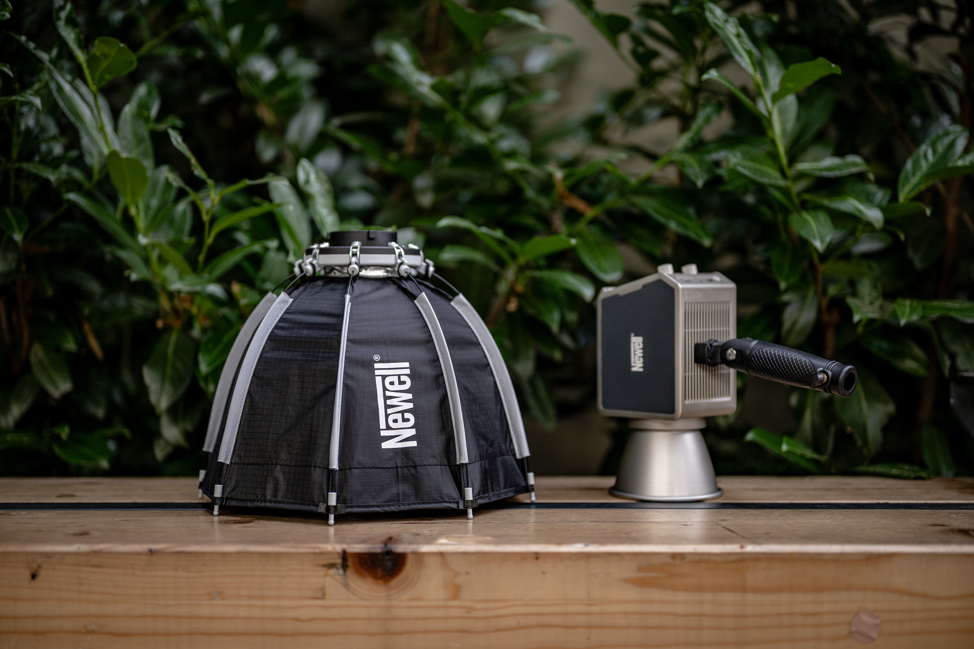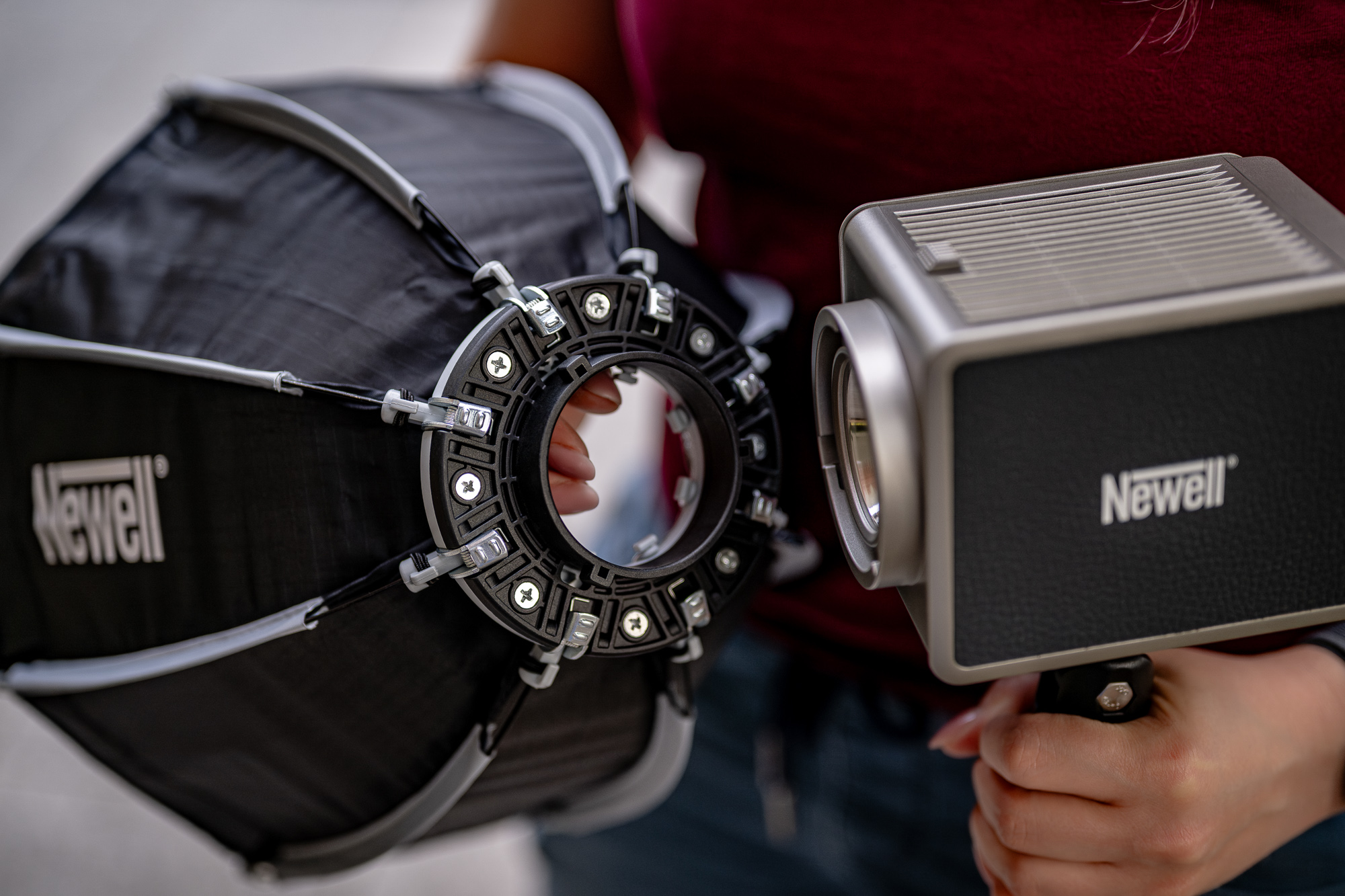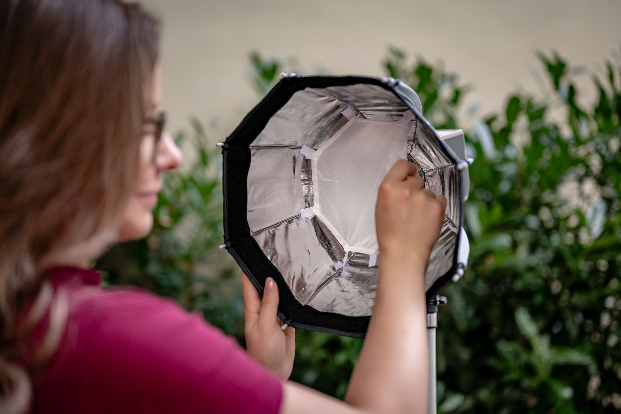 Prezentowany softbox oktagonalny Newell oferuje 30 cm średnicy po rozłożeniu. Taki modyfikator nie dominuje na planie zdjęciowym i nie zasłania kamery czy monitora. Na pewno docenisz go podczas pracy w ciasnych pomieszczeniach. To idealny kompromis pomiędzy mobilnością a funkcjonalnością – oferuje wystarczająco dużą powierzchnię, by zmiękczyć światło, ale jest na tyle mały, by zmieścić się nawet w bardzo małym studio.