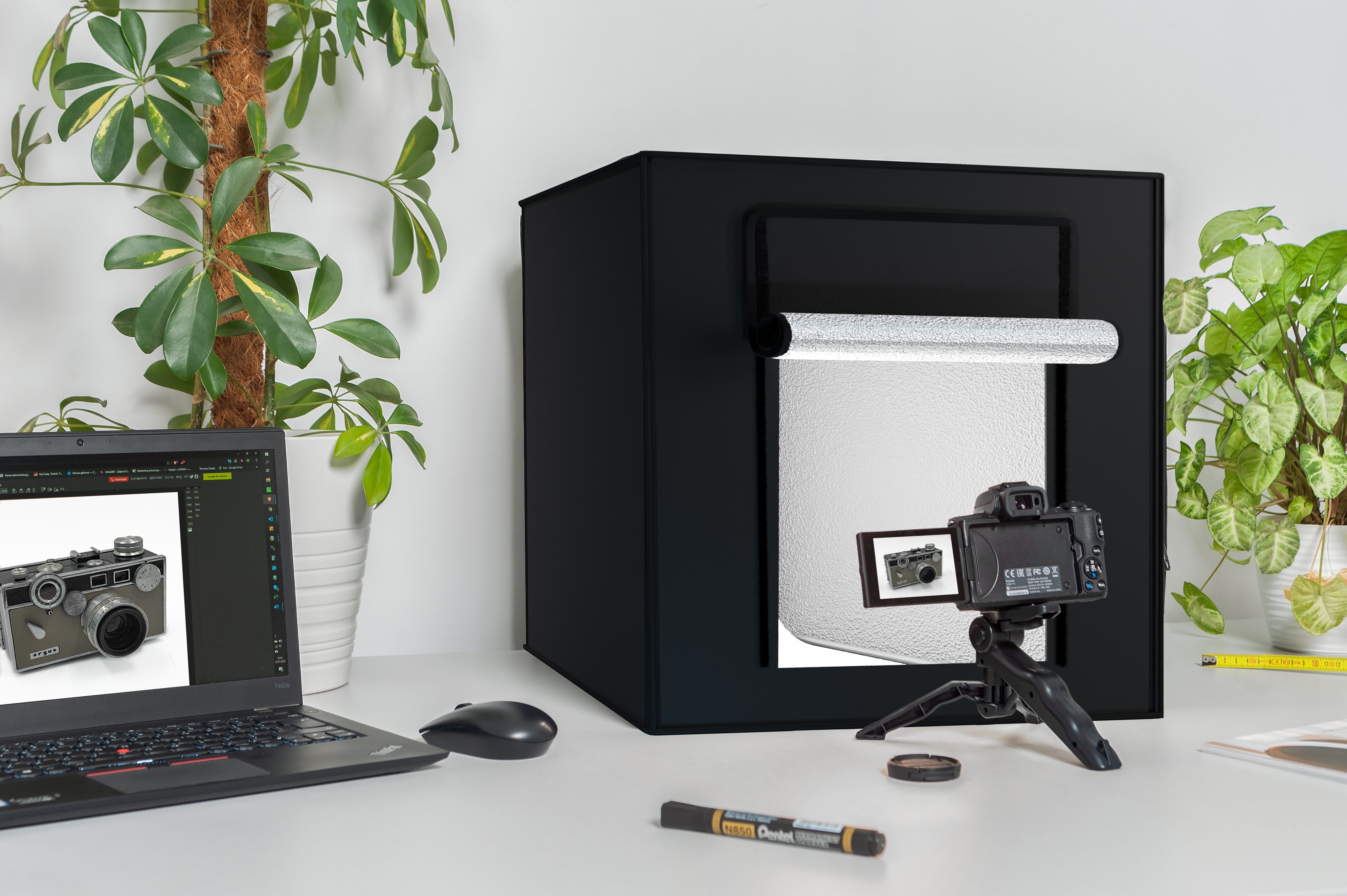 - składany namiot bezcieniowy do fotografii produktowej o wymiarach 80 x 80 x 80 cm