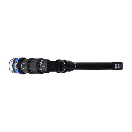 - Peryskopowy element optyczny – zakrzywiona konstrukcja tubusu umożliwia filmowanie obiektów na poziomie gruntu przy jednoczesnym utrzymaniu kamery na wygodnej wysokości. Idealny do ujęć zwierząt, roślin i obiektów znajdujących się blisko podłoża, gdzie tradycyjne ustawienie kamery byłoby niepraktyczne. Obrót o 360° pozwala precyzyjnie kontrolować orientację kadru.