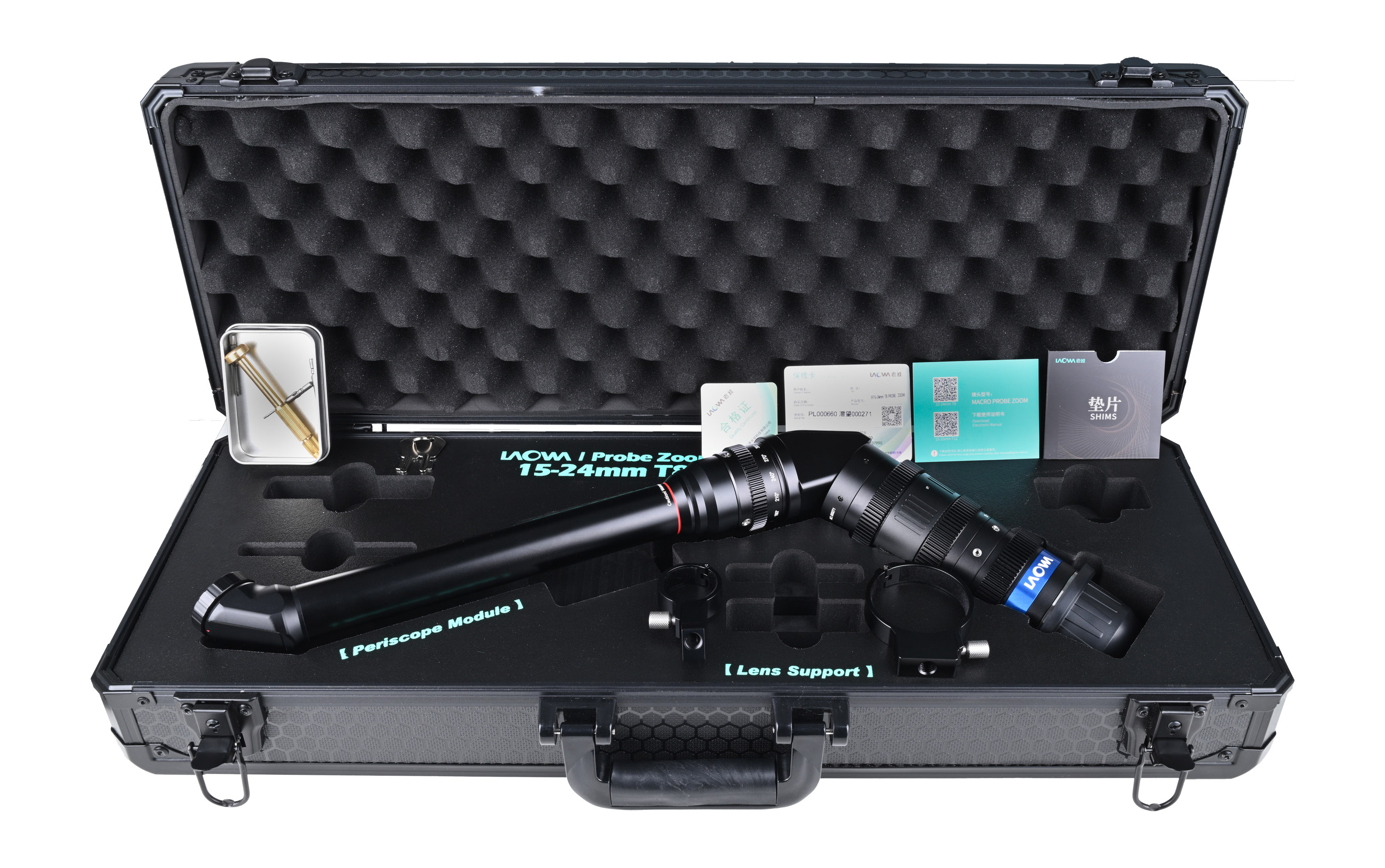 Laowa Probe Zoom 15-24 mm T8 dostarczany jest w solidnej walizce zamykanej na klucz, która zapewnia maksymalne bezpieczeństwo podczas transportu i przechowywania. Jej wnętrze wypełniono pianką z precyzyjnie wyciętymi przegródkami, które idealnie dopasowują się do kształtu obiektywu i chronią go przed wstrząsami oraz uszkodzeniami mechanicznymi. W walizce znajdziesz również obejmy z gwintem do montażu obiektywu na szynie stabilizacyjnej, co ułatwia integrację z rigami filmowymi i systemami wsparcia. Dołączono również zestaw kluczy do walizki, precyzyjne śrubokręty oraz podkładki pod bagnet („shims"), które pozwalają na dokładną regulację ustawień ostrości – „back focus" i „front focus".