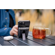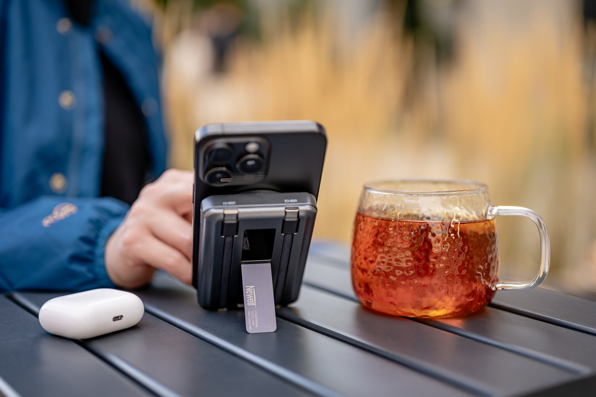 Odchylana aluminiowa podstawka to sprytny dodatek, który zmienia power bank Newell MS-10000 Pro w wygodną stację dokującą. Wystarczy postawić na niej telefon, by móc prowadzić wideorozmowy, oglądać filmy czy przeglądać media społecznościowe. W tym czasie urządzenie cały czas się ładuje. To idealne rozwiązanie zarówno w domu, jak i w podróży służbowej czy podczas pracy w kawiarniach.