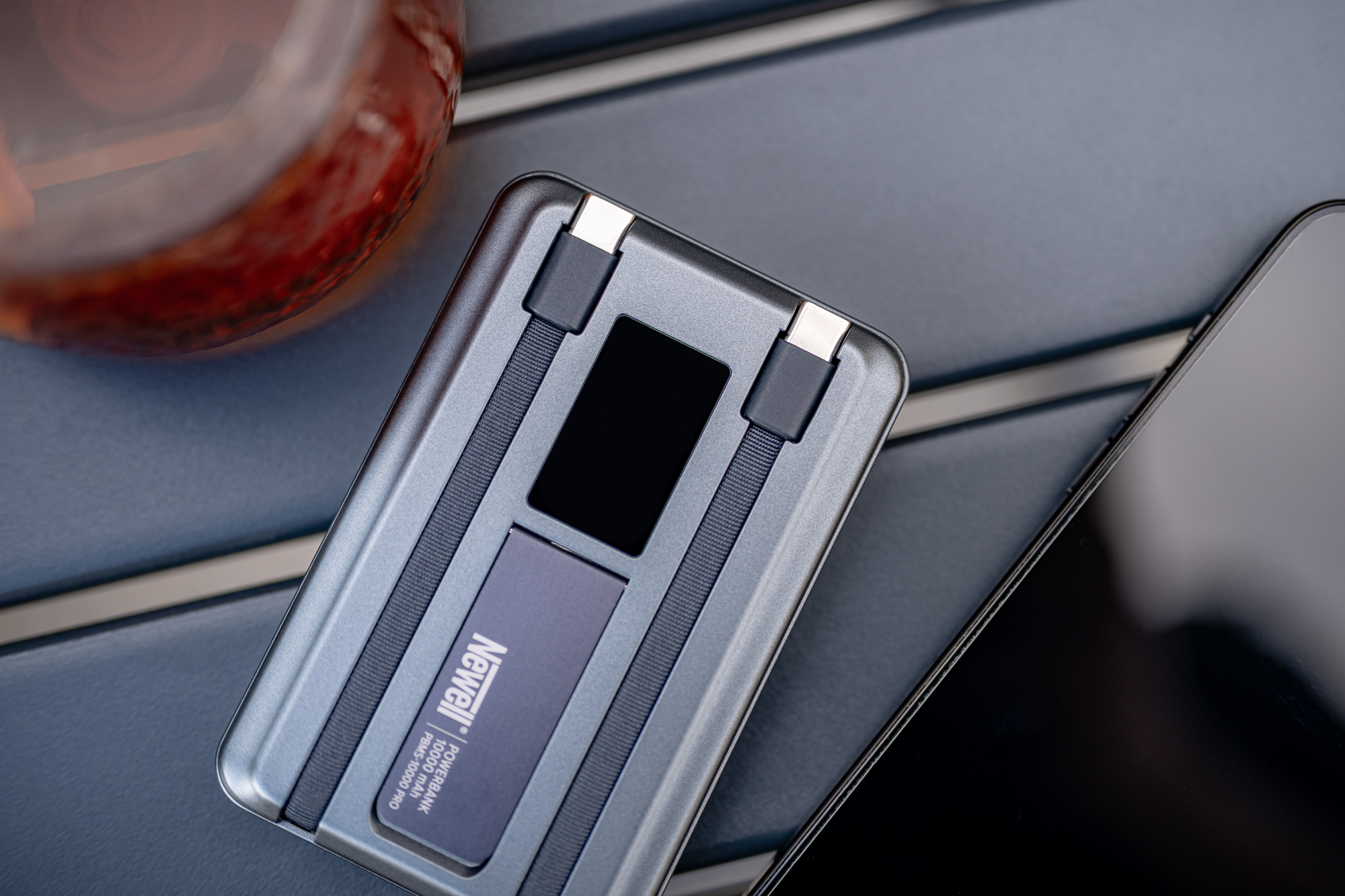 W obudowie Newell MS-10000 Pro MagSafe sprytnie ukryto dwa kable, umieszczone w precyzyjnie dopasowanych slotach. Dzięki temu nie plączą się, nie wystają i nie zajmują dodatkowego miejsca, a całość zachowuje estetyczny wygląd. Gdy potrzebujesz naładować urządzenie, po prostu wysuń kabel i podłącz go do swojego sprzętu. To proste i praktyczne rozwiązanie, które eliminuje bałagan w torbie i gwarantuje, że dwa kable USB-C, pasujące do setek popularnych urządzeń, będą zawsze pod ręką.