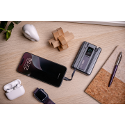 - power bank z funkcją ładowania bezprzewodowego i 2 zintegrowanymi kablami