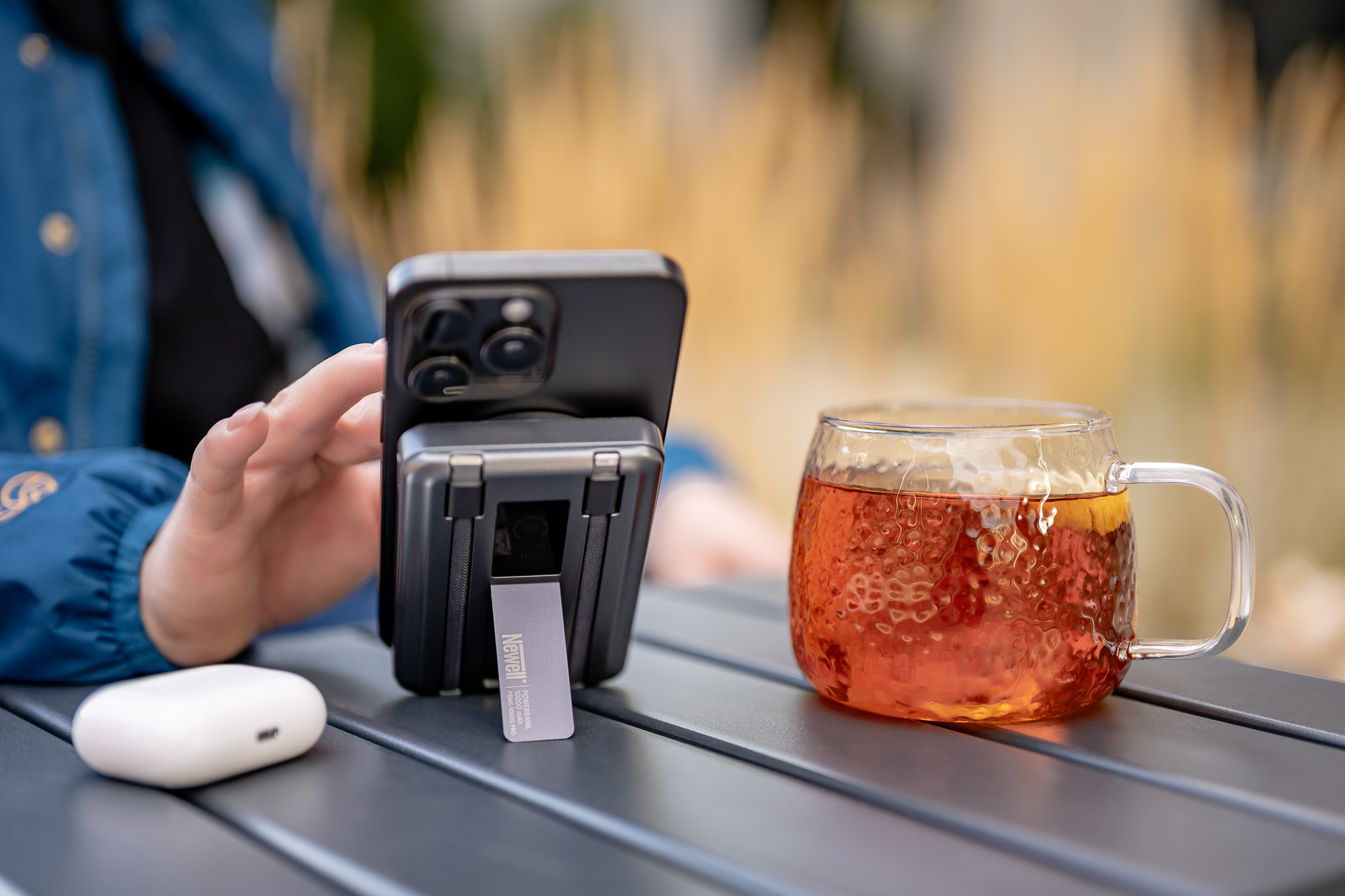 Odchylana aluminiowa podstawka to sprytny dodatek, który zmienia power bank Newell MS-10000 Pro w wygodną stację dokującą. Wystarczy postawić na niej telefon, by móc prowadzić wideorozmowy, oglądać filmy czy przeglądać media społecznościowe. W tym czasie urządzenie cały czas się ładuje. To idealne rozwiązanie zarówno w domu, jak i w podróży służbowej czy podczas pracy w kawiarniach.