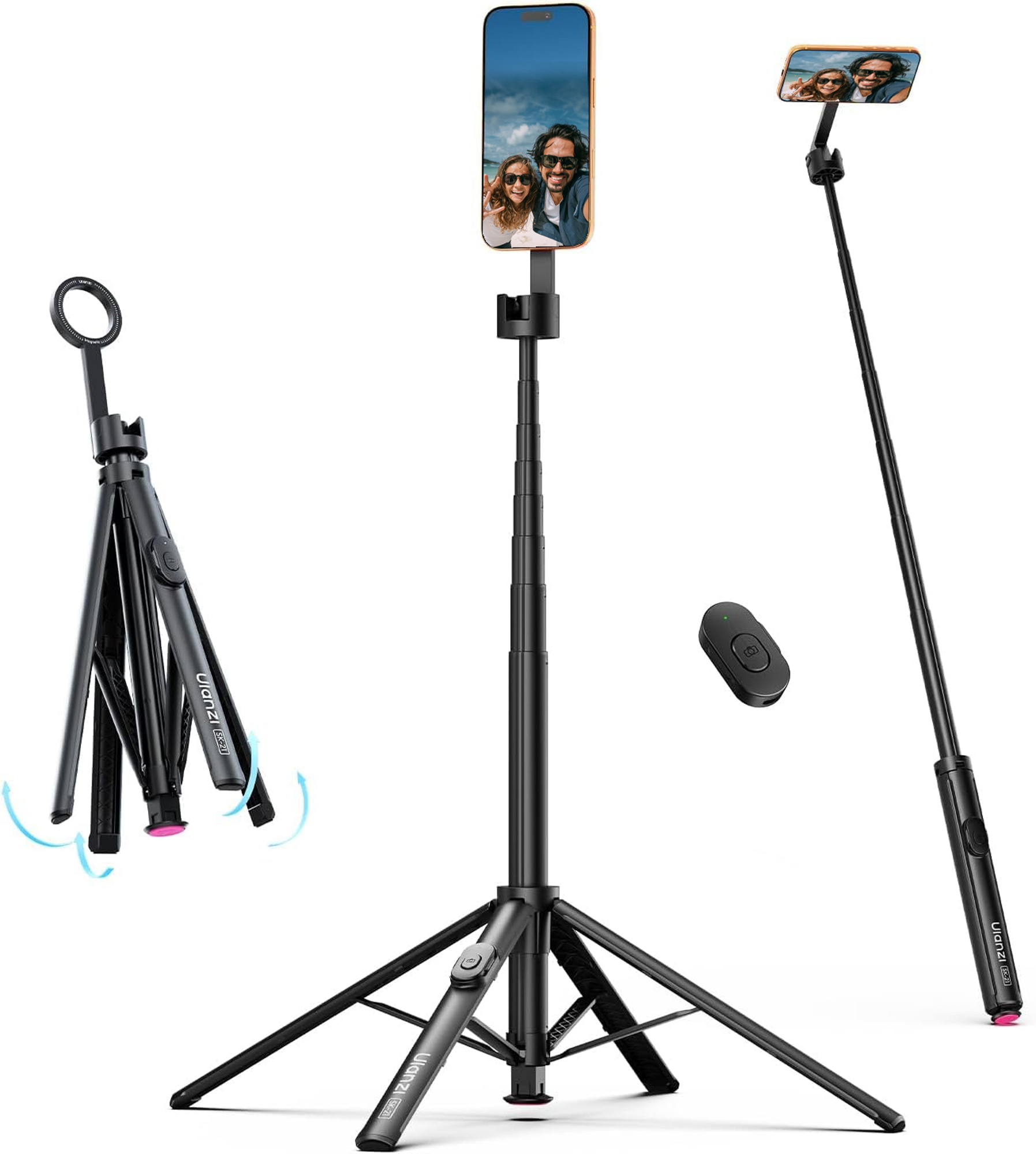 Ulanzi SK-21 Auto-Open to kompaktowy statyw z magnetycznym mocowaniem MagSafe. Wystarczy nacisnąć przycisk, aby cztery nogi rozłożyły się automatycznie, bez potrzeby ręcznego manipulowania każdą z nich. Podwójne magnetyczne mocowanie umożliwia instalację smartfona z przodu i dodatkowego akcesorium z tyłu. Urządzenie może pracować w dwóch trybach – jako kijek selfie lub jako tradycyjny statyw. Maks. wysokość to aż 180 cm. Osiem wysuwanych sekcji umożliwia precyzyjną regulację wysokości, a przegubowe ramię pozwala ustawić telefon pod wybranym kątem. Zdalne sterowanie zapewnia dołączony do zestawu pilot Bluetooth. Statyw waży tylko 380 g i po złożeniu ma niespełna 30 cm długości. Jego maksymalny udźwig to 800 g. To najlepszy wybór dla vlogerów, podróżników i twórców treści.