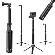 Telesin GP-MNP-090-S to pięciosekcyjny kijek selfie wykonany z aluminium lotniczego. Jego długość może wynieść od 20 do 90 cm. Do zestawu dołączono ministatyw. Po przykręceniu go do selfie sticka, jego złożone nóżki biegną wzdłuż uchwytu, poprawiając chwyt i nie zajmując dodatkowego miejsca. Mocowanie GoPro, które wieńczy całą konstrukcję, pozwala pochylić kamerę sportową w zakresie 180°. Uchwyt na smartfon możesz zainstalować zarówno na rączce (jako podgląd dla sparowanej kamery), jak i na końcu selfie sticka (adapter na gwint 1/4" w zestawie). Całość waży jedynie 150 gramów.