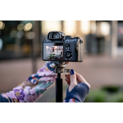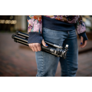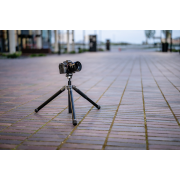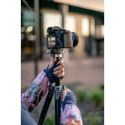 Fotopro Fly-1 to wielozadaniowy i lekki statyw, który świetnie sprawdzi się podczas fotograficznych podróży. Unikalny kształt kolumny centralnej pozwala umieścić nogi bliżej siebie, przez co urządzenie zajmuje jeszcze mniej miejsca po złożeniu. Statyw oferuje wysokość roboczą w przedziale od 28,3 do aż 150,5 cm i waży zaledwie 1 kg. Dzięki systemowi obrotowych zacisków rozłożysz go w ciągu kilku sekund. W dolnej części kolumny centralnej znajdziesz specjalny hak, na którym możesz zawiesić obciążenie. Po jego odkręceniu znajdziesz specjalną skrytkę na składany uchwyt, umożliwiający instalację smartfona bezpośrednio na głowicy kulowej. Statyw wyposażono również w 2 gwinty montażowe 1/4", antypoślizgowe nóżki, poziomicę, system kontroli panoramy oraz podziałkę kątową.