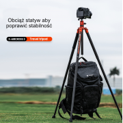 Zmodyfikowana konstrukcja statywu X-Aircross trzeciej generacji sprawia, że zajmuje on jeszcze mniej miejsca. Jego wysokość w pozycji transportowej to 36,5 cm. Całość wykonano z lekkiego i wytrzymałego włókna węglowego 3K. Ponadto, jedną z 3 nóg statywu wykończono przyjemnym w dotyku silikonowym uchwytem. Producent nie zapomniał też o antypoślizgowych nóżkach oraz haku, na którym zawiesisz dodatkowe obciążenie, zapewniające sobie odpowiednią stabilność podczas wietrznych dni.