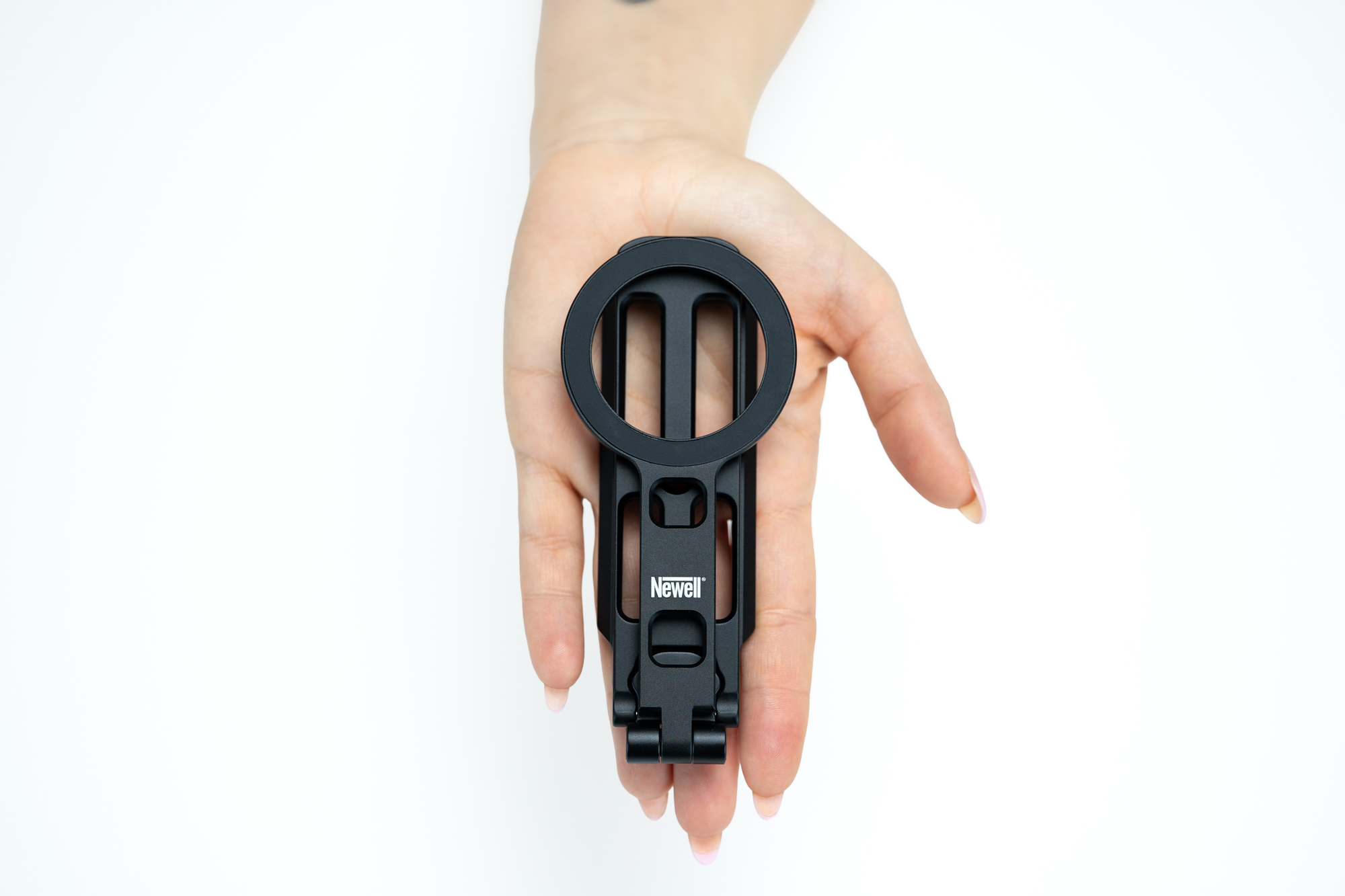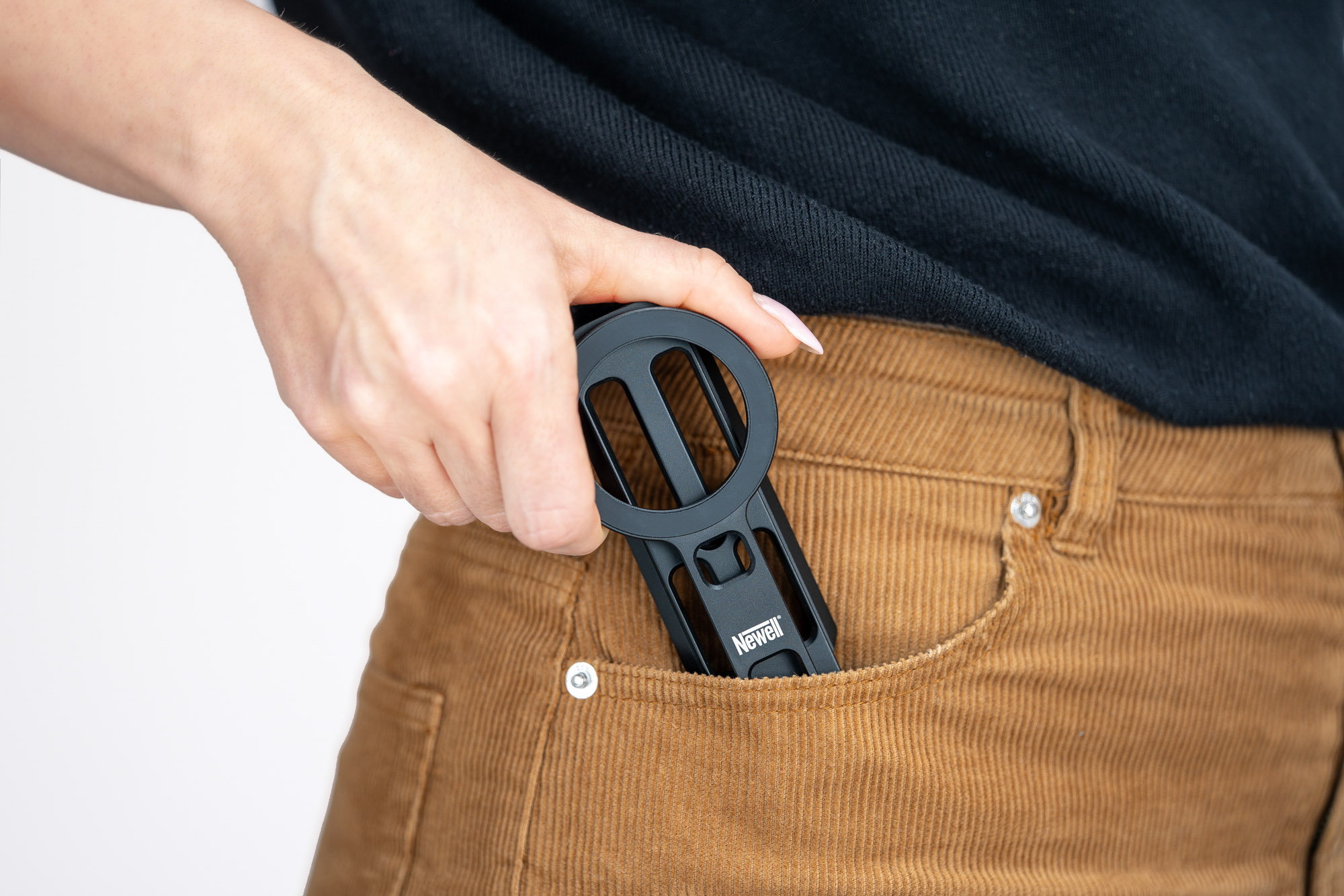 Aluminiowa obudowa zapewnia odpowiednią sztywność i odporność na codzienne użytkowanie, a jednocześnie pozwala zachować niewielką wagę – zaledwie 114 g. Po złożeniu statyw Newell z uchwytem MagSafe M-Stand mieści się w dłoni, co ułatwia transport i przechowywanie. Bez problemu wrzucisz go do torby fotograficznej, plecaka lub kieszeni, gdzie będzie zawsze gotowym do użycia.