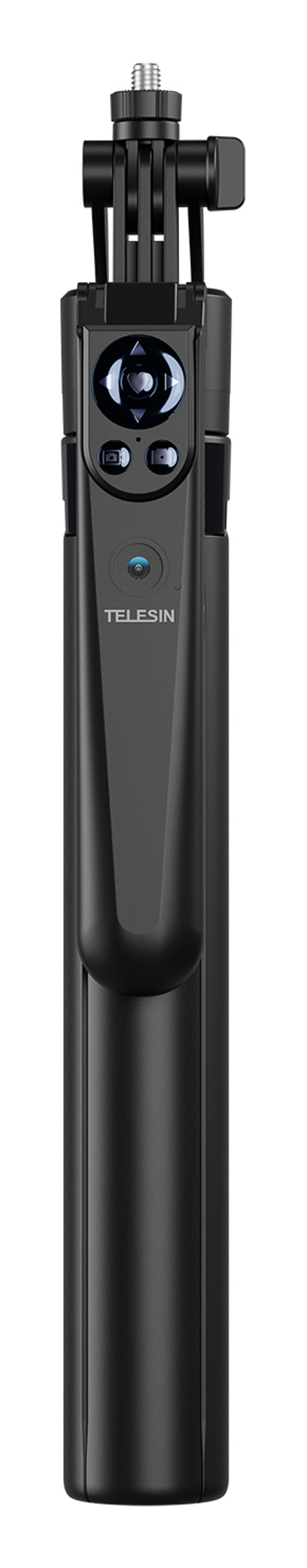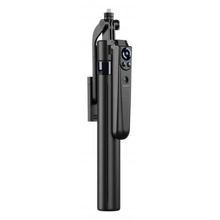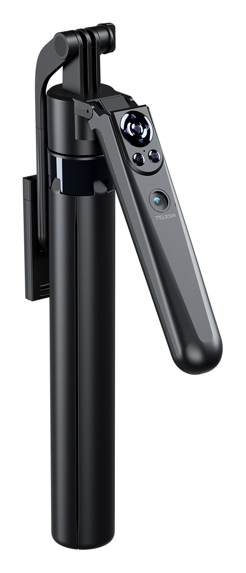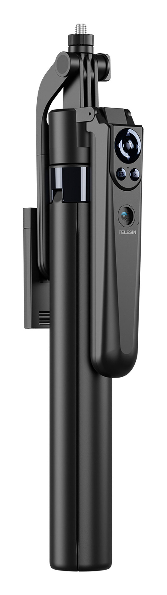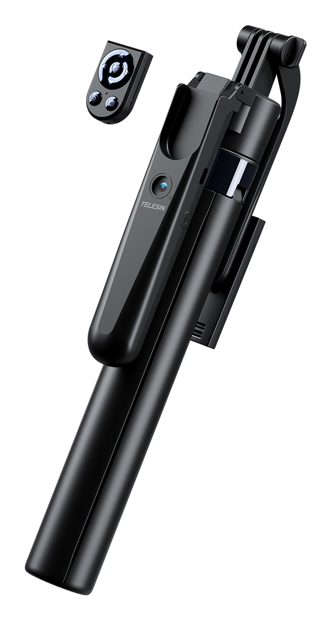 W zestawie ze statywem Telesin P3-MS-03 znajdziesz też pilota Bluetooth. Możesz go umieścić w specjalnym slocie znajdującym się nad czujnikiem ruchu. Po wyjęciu działa jako bezprzewodowy kontroler z zasięgiem do 9 metrów. Z jego pomocą możesz rozpocząć i zatrzymać nagrywanie, a także wykonać zdjęcie. To szczególnie przydatne podczas samodzielnej realizacji nagrań, gdy statyw stoi z dala od Ciebie.