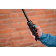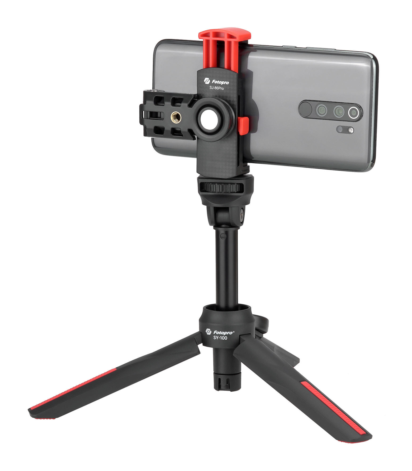 Uchwyt na smartfon wspiera urządzenia o szerokości od 56 do 86 mm. Dwa czerwone przyciski pozwolą zablokować zacisk w optymalnej pozycji, a gumowe okładziny zabezpieczą krawędzie urządzenia, którym nagrywasz. Telefon możesz ustawić w pionie lub w poziomie, a w razie potrzeby wyregulować również kąt jego nachylenia. Statyw Fotopro SY-100 z uchwytem SJ-86 Pro oferuje również dodatkowy punkt montażowy umieszczony na przegubowym ramieniu. W razie potrzeby możesz złożyć je i ukryć za uchwytem. A kiedy z niego korzystasz obrotowa głowica pozwala zmienić pozycję modułu w zakresie niemal 360º względem Twojego smartfona.